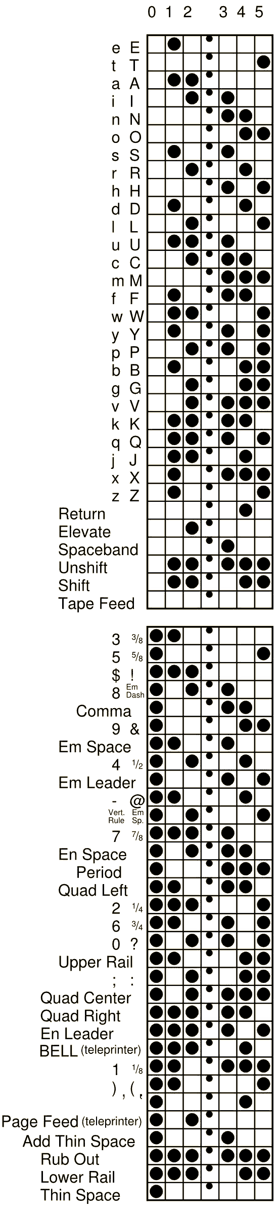 ![]() Volgende pagina: kodes met meer bits, modems, telex Een systeem dat het vermelden waard is, is het systeem van de linotype. Dit is geen normale printer, maar een letterzetter die loden reepjes giet met daarop de letters die gedrukt moeten worden. De linotype staat in de drukkerij zodat de gemaakte tekst direct geprint kon worden (de linotype werd hoofdzakelijk gebruikt voor dagbladen). De linotype in de drukkerij kon lokaal bediend worden voor het opstellen van tekstregels, maar sommige toestellen konden teksten ontvangen via ponsband. De teksten werden vooral opgesteld in de redactie, die vaak op een andere plaats gelegen was. In de redactie was er een speciale schrijfmachine die de tekst kon opmaken in een formaat die door de linotype verwerkt kon worden. De tekst werd geponsd op tape om dan op hoge snelheid door te sturen naar de drukkerij. Daar werd de tekst opnieuw geponsd om door de linotype verwerkt te worden. Men gebruikte vaak ponsband als tussenmedium omdat die aan een constante hoge snelheid kon werken (sneller dan dat de linotype de teksten kon gieten). De telefoonlijn kon daardoor sneller vrijkomen.