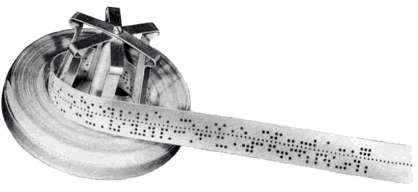 Rechts heb je de linotype-kode, die ook TTS (teletypesetter) genoemd wordt. Dit is de enige 6 bits kode die gestandardiseerd was en door alle letterzetmachines gebruikt kon worden. Er bestaan andere 6-bits kodes, die door andere fabrikanten ontworpen zijn geweest en niet compatibel waren. Hoewel dezelfde ponspachines en modems gebruikt konden worden was de afdruk meestal niet leesbaar omdat de positie van bepaalde letters verschillend was. ![]() Dit is een ponsband die gebruikt werd om de teksten voor de linotype klaar te maken voor verzending naar de drukkerij.