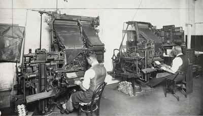 Een werkplaats met twee linotypes, de machines staan in de drukkerij zodat de gegoten regels direct gebruikt kunnen worden. De teksten die afkomstig zijn van de redactie worden doorgestuurd met de telex. Later zal men ook letterzetmachines aantreffen in de redactie zelf (maar zonder het gieten van de letters). Dit heeft een tijdswinst tot gevolg, want de tekst moet slechts éénmaal ingevoerd worden. De aparte zetmachines werden enkel gebruikt in de grote kranten, want er is een speciale operator nodig. De machine die hier getoond wordt heeft al een ponsbandlezer. De tekst wordt opgesteld in de redactie, op ponsband gezet, doorgestuurd via de telefoonlijn, ontvangen in de drukkerij waar er opnieuw ponsband gebruikt wordt. De ponsband wordt dan door de linotype gelezen. Door de asynchrone werking kan de telefoonlijn en de machines aan de hoogst mogelijke snelheid werken, maar er zijn twee twee ponsbanden als tussenopslag nodig. De linotype interesseert mij bijzonder omdat ik als jobstudent in een drukkerij gewerkt heb. De linotype was een ongelofelijke machine (ik mocht zelfs niet in de buurt van de machine komen). Mijn vader werkte bij IBM op de OP-afdeling (Office Products) en in het bijzonder op de electronic selectric composer, een schrijfmachine met proportioneel schrift voor de foto-letterzetter. |