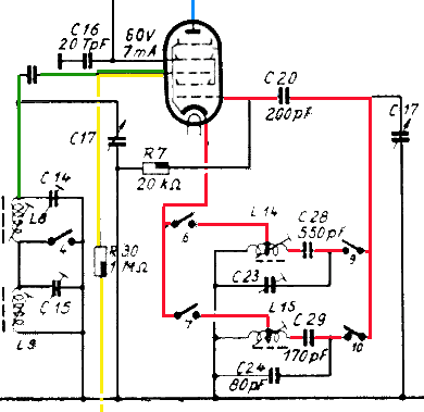 De praktische schakeling komt van een radio Schaub Koralle uit de jaren 1950. De radio gebruikt een typisch amerikaans schema uit de jaren 1930, daarom dat de schakeling hier opgenomen wordt. De zelfoscillerende mengtrap is een EK90 / 6BE6.