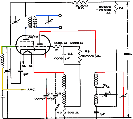 Amerikaanse ontvangers in het interbellum: pentagrid converterHet principe van de superheterodyne wordt simultaan toegepast in Europa en in de Verenigde Staten, maar de buizen die in beide continenten gebruikt worden zijn verschillend. In Europa geeft men de voorkeur aan de octode met zijn 8 electrodes, maar in de Verenigde Staten werkt men liever met een hexode of een heptode ("pentagrid converter").Ten overstaan van de heptode heeft de hexode geen keerrooster, maar in deze toepassing is een keerrooster minder belangrijk omdat de buizen in amerikaanse radiotoestellen zonder transformator gebruikt worden, waarbij de hoogspanning ongeveer 110V bedraagt. Eerste principeschakeling links, amerikaans systeem: de trilkring is geplaatst tussen de cathode en het eerste rooster in een gemeenschappelijke anodeschakeling, de versterking ontstaat dankzij het tweede rooster dat op een vaste positieve spanning gehouden wordt en als anode voor de trillingskring dient. De buis is wat eenvoudiger dan de europese octode. In Amerika proberen de fabrikanten hun radio's zo goedkoop mogelijk te maken, en een buis met een rooster minder is natuurlijk goedkoper. Bij alle praktische schakelingen worden de volgende kleuren gebruikt: