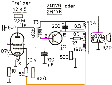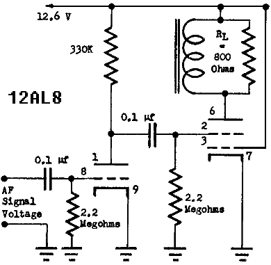Ander voorbeeld van voorversterker en drivertrapDe lampen die op een lage spanning gebruikt worden hebben een lage versterking van µ = 13 voor de triode en µ = 7.2 voor de tetrode (12AL8) dat men twee elementen moet gebruiken om aan de versterking van een normale triode (EC(C)83 te komen.Een voorbeeld van een gecombineerde voorverterker + driver is de 12AL8 die bestaat uit een triode die geschikt is voor laagspanning en een ruimteladingstetrode. De elementen (cathode, anode en roosters) zijn relatief groot om tot een voldoende stroom te komen. Hier ook heeft men een hoge gloeivermogen nodig: 550mA bij 6.3V (3.5W). De triode werkt met de volgende instelling: Ia = 0.5mA, Ug = -0.9V, de negatieve spanning ontstaat door de roosterlekweerstand van 2.2MΩ. De tetrode werkt met Ug1 = 12.6V en Ig1 = 75mA. Ia bedraagt 40mA in rust en 8mA bij de maximale uitsturing, want het rooster werkt als een diode en doet het werkpunt verschuiven. De schakeling die hier getoond wordt kan een vermogen van 40mW leveren aan de getransistoriseerde eindtrap. 40mA is juist voldoende om een hoogohmige koptelefoon aan te sturen. Indien men zelf een schakeling zou bouwen, kan men een voedingsspanning van bijvoorbeeld 24V gebruiken. De spanning op de ruimteladingsmooster moet beperkt worden tot 10V, wat men kan bereiken door een weerstand van 180 à 200Ω naar de pluspool. De weerstand moet naar massa ontkoppeld worden door een elko van 100µF. Men heeft een vermogen van 120mW bij een spanning van 24V.