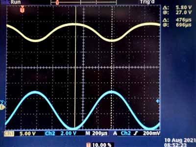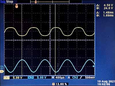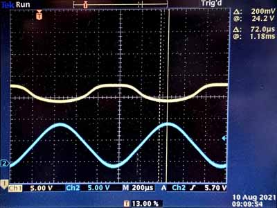 Beam tetrodes normaal aangeslotenDe werking als ruimteladingsbuis is niet optimaal, de buis werkt beter als normale beam tetrode (vermogen 250 à 300mW). De PL504 heeft een hoge perveance en een schakeling om de ruimtelading op te heffen werkt eigenlijk niet zo goed. De stuurrooster moet nu een negatieve polarisatie hebben van 1V, wat bereikt kan worden met een ontkoppelde (470µF) cathodeweerstand van 39Ω.In werking met ruimtelading heeft men een stuurspanning van 4V effectief nodig, zodat een voortrap nodig is. Bij een normale aansluiting heeft men een spanning nodig van 1.8V, wat te verwachten is (een voortrap is hier ook nodig). Het vermogen wordt gehaald door de hoogst mogelijke stroom door de buis te sturen (je loopt geen risico om de anode te overbelasten met zo'n lage spanning). Bepaalde kleine voedingstransformatoren die als outputtransfo gebruikt worden kunnen echter verzadigd geraken door de hoge permanente stroom. Een outputtransfo dat gerecycleerd wordt uit een oude lampenradio kan hier gebruikt worden, want die werd ontworpen voor een permanente stroom (aanwezigheid van een luchtspleet). Het laaste skoopbeeld is van een normaal aangesloten EL508. Het ingangssignaal bedraagt 8Vpp (2.8Veff) met een positieve roosterspanning van 1V. De amplitude van het uitgangssignaal bedraagt 4.5V en is sterk vervormd, zowel in positieve als negatieve zin (een teken dat de instelling niet verbeterd kan worden). De gemiddelde anodestroom bedraagt 22mA en de schermroosterstroom 12mA. De voedingsspanning bedraagt 24V, die men kan bereiken door de gloeispanning van een PL508 (17V) gelijk te richten. De aangesloten weerstand bedraagt 100Ω en men ziet dat de buis beter gediend zou zijn met een hogere impedantie. De EL508/PL508 heeft een lagere versterking en kan een signaal van lagere amplitude geven: deze buis is minder geschikt om op een lage spanning te werken. |