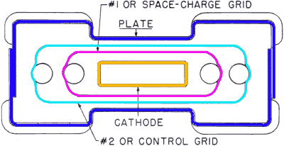 Geschiedenis van de ruimteladingsbuizenDe ruimteladingsbuizen werden reeds in de jaren 1920 ontworpen, dus ongeveer samen met de triodes en tetrodes, maar ze werden niet gecommercialiseerd. De bedoeling was toen de lage emissiviteit van de wolfram cathodes te verbeteren (er bestonden toen geen cathodes met bariumoxidelaag).Deze buizen hadden een hogere gloeivermogen nodig et er vloeide een roosterstroom. De buizen hebben een slecht rendement en kunnen een beperkte anodestroom van enkele milliampères leveren, terwijl de roosterstroom tot 100mA kan oplopen.