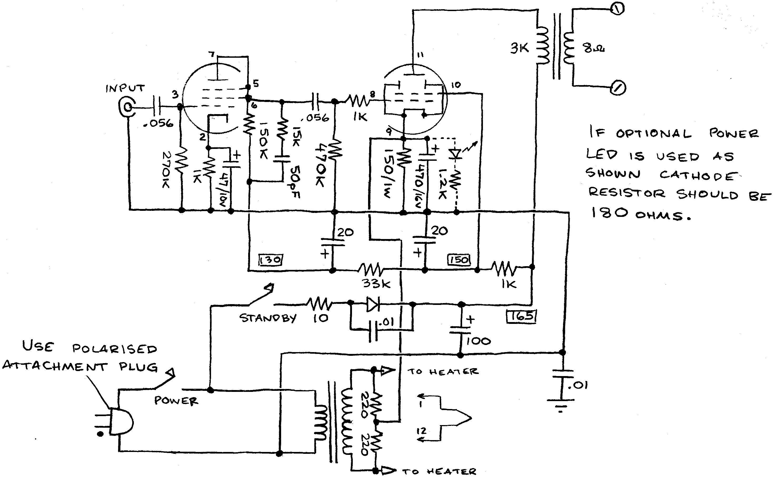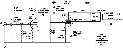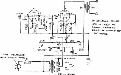 De voorversterkerpentode is geschakeld als triode, want de hoge gain van een pentode is niet nodig (de ontwerper had misschien beter een vorm van tegenkoppeling toegepast om de vervorming van 12% op maximaal vermogen naar beneden te halen).