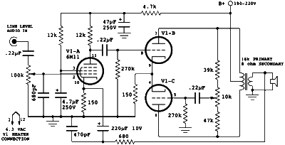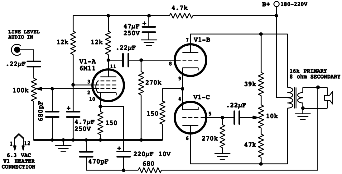 6M11De pentode is vergelijkbaar met een 6EW6 (algemene pentode voor IF versterking) en de dubbele triodes zijn vergelijkbaar met 12AT7 (ECC81). Men merkt direct dat een dergelijke versterker geen al te hoog vermogen kan leveren, ongeveer 350mW.