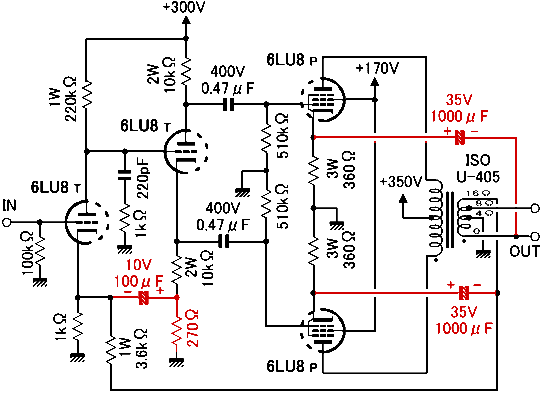 6LU8Dit is een stuur- en eindtrap voor de rasterafbuiging van kleurentelevisies. De triode heeft een gemiddelde versterking (µ = 54 en S = 3.6mA/V), een maximale anodedissipatie van 2.5W en een maximale stroom van 30mA (105mA piek). De tetrode heeft een anodedissipatie van 14W en een gemiddelde anodestroom van 75mA (260mA piek).Het is een gecombineerde buis zoals onze PCL805 (rasterafbuiging zwart-wit televisies), maar met de eindtrap die een hoger vermogen kan leveren zoals onze PL508 (rasterafbuiging kleurentelevisies). Er zijn echter niet zoveel schakelingen met deze buis, en de weinige schakelingen die ik gevonden heb vertonen nogal wat gebreken (klik op de afbeelding voor uitleg). Eén van de regels is dat de schakeling zo eenvoudig mogelijk moet zijn, zeker wat de tegenkoppeling betreft. Hoe ingewikkelder de tegenkoppeling, hoe meer problemen er kunnen ontstaan met de stabiliteit van de versterker.