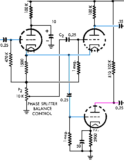 De eerste triode is een impedantie-adapter zonder spanningsverterking. De spanning gaat naar de cathode van de bovenste triode van de splitter en naar het rooster van de onderste fasesplitter. De onderste triode versterkt het signaal en keert de fase om (cyan verbinding wordt magenta verbinding).