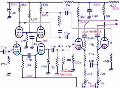 De schakeling links is een moderne long tail / Mullard die gebruik maakt van de negatieve roostervoorspanning voor de eindtrappen om het werkpunt van de voorversterkerbuizen te stabiliseren. De eerste trap gebruikt twee ECC83 in een cascodeschakeling met een anodestroom van ongeveer 1mA. De anodespanning van de bovenste buis is ongeveer 160V: het is niet mogelijk een gelijkspanningskoppeling te maken met de volgende trap, dit is enkel mogelijk als die trap een cathodyne zou zijn.