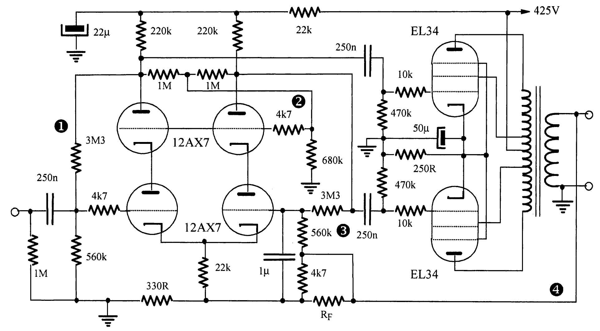 We hebben eerst een dubbele lokale tegenkoppeling aangegeven 1 en 3, een weerstand van 3.3MΩ van de anode naar het stuurrooster. De mate van tegenkoppeling hangt af van de impedantie van de bron en is dus niet optimaal. De dubbele tegenkoppeling wordt ook gebruikt om het werkpunt in te stellen. De tegenkoppeling aangeduid met 2 wordt meer in detail besproken op de paghina waar een schakeling besproken wordt die ik super mullard heb genoemd. De werking van de tegenkoppeling is identiek, dat het signaal van tegenkoppeling naar de cathode of naar de roosters van de bovenste buizen gestuurd wordt zoals hier. De schakeling is trouwens geen echte cascode, want de bovenste roosters zijn niet ontkoppeld. En dan hebben we nog de globale tegenkoppeling 4 die van de uitgang van de transfo naar de cathodes van de onderste buizen gaat. De schakeling werd uit het stof gehaald door Igor Popovich. Het is een schakeling die als voorbeeld gegeven wordt want die is eigenlijk te complex voor wat de schakeling moet doen. Een van de grondregels van de electronica is dat als een complexe schakeling slechts marginaal beter presteert dan een eenvoudige schakeling, dat je beter voor de eenvoudige schakeling zou opteren. Een wetmatigheid die huidige ontwerpers en programmeurs beter zouden moeten respecteren.