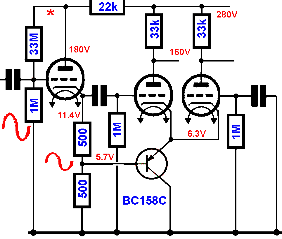 Als we op de ingang van de schakeling en wisselspanning van 10V hebben, dan hebben we op iedere anode een wisselspanning van 40V. De ECC82 heeft in deze schakeling namelijk een spanningsversterking van tweemaal 5× en de voortrap van 0.8×. De anodeweerstand van 22kΩ dient om de dissipatie in de voortrap te beperken maar ook om de schakeling te stabiliseren. Men moet namelijk 11.4V hebben om de cathode (5mA). Heeft de buis een hogere of lagere versterking, dan heeft dit een invloed op de cathodestroom, maar natuurlijk ook op de anodestroom, en dus de spanning over de weerstand van 22kΩ die de stroom stabiliseert via de weerstand van 33MΩ. * Aan dit punt moet er nog een elko naar massa voorzien worden zodat de wisselspanning niet kan terugvloeien naar de ingang. 10µF:350V is voldoende. |