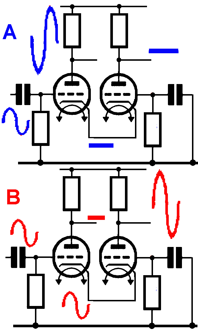 Omgekeerd, zetten we een gelijke wisselsspanning zoals op de ingang van de gestuurde triode op de gemeenschappelijke, dan hebben we geen wisselspanning op de anode van de gestuurde triode en een spanning van 10V op de anode van de niet gestuurde triode. De wisselspanning op de gemeenscheppelijke cathode moet dus precies de helft zijn van de spanning op het rooster van de gestuurde triode. Dan staat er een gelijke wisselspanning van 5V op beide anodes. We gaan dit realiseren met de volgende schakeling. We hebben eerst een triode die voor een laagohmige uitgang moet zorgen. Daarmee wordt ook de linkse triode gestuurd. Met de spanningsdeler bekomen we de halve wisselspanning die we nodig hebben. De transistor is een exemplaar met hoge versterking, zodat de spanningsdeler nauwelijks belast wordt. Op de gemeenschappelijke cathode hebben we een wisselspanning die precies de helft is dan de spanning op de gestuurde triode.