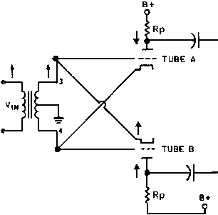 De schakeling rechts is de principeschakeling van de cross coupled fase omkeertrap. In de praktijk wordt de transformator vervangen door twee cathodevolgers.