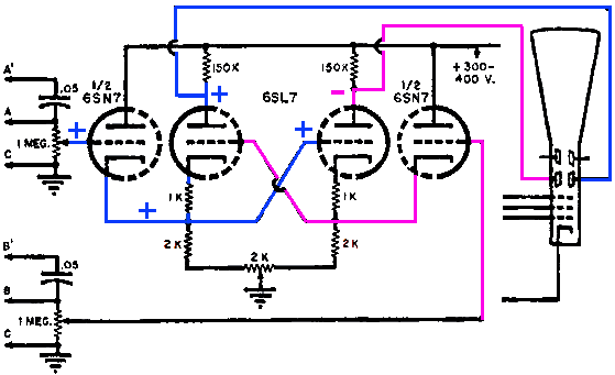 De versterkertrap werd ontworpen door Van Scoyoc, maar zijn bedoeling was niet specifiek om een omkeertrap van een audioversterker te maken. Hij wou twee spanningen kunnen vergelijken en de output naar de platen van een oscilloscopp sturen, maar de schakeling kan natuurlijk ook als fasedraaier gebruikt worden. De cross coupled fase omkeertrap zal je niet vaak aantreffen in amateurontwerpen omdat de werking van de schakeling op het eerste zicht niet zo duidelijk is. Daarbij komt nog dat de schakeling best twee verschillende soorten buizen gebruikt. De schakeling kan uitgelegd worden als een cathodevolger (om de impedantie te verlagen) gevolgd door een versterkertrap. De twee middelste buizen (6SL7) zijn de versterkertrappen en worden aangestuurd op de cathode door het gebufferd ingangssignaal 1 en op zijn rooster door het ingangssignaal 2. De tweede versterkertriode krijgt ook het gebufferd ingangssignaal op zijn rooster en geeft een negatief signaal op de anode.