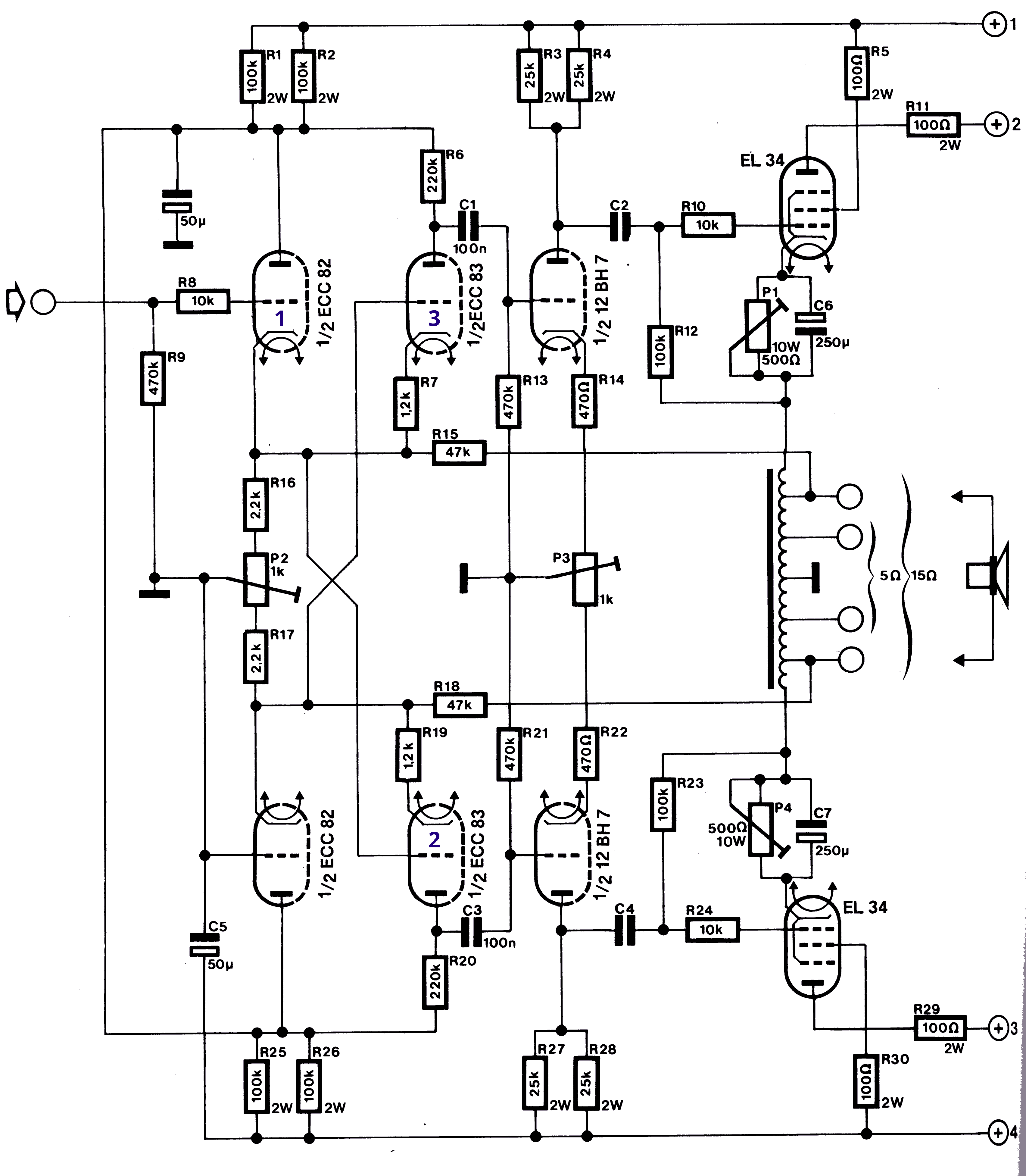 Door de gemeenschappelijke anodeschakeling kan men het terugkoppelsignaal gemakkelijk terugvoeren via R15 en R18. De sturing van de outpouttransformator heeft een lage inwendige weerstand. Opslingeringen in de transformator worden gemakkelijk onderdrukt. De schakeling gebruikt een dubbele triode ECC82 als cathodevolger (ingangstrap), een ECC83 als spanningsversterkertrap en een 12BH7 als drivertrap. Deze laatste buis is pencompatibel met de buizen uit de reeks ECC81 tot ECC83 maar heeft andere instellingen. De 12BH7 heeft een lage versterkingsfactor (µ = 17) zoals de ECC82, maar een hoge steilheid van 3.1mA/V. Terloops gezeld, de 12BH7 buis kan als eindtrap gebruikt worden in een kleine balansversterker met een vermogen van 5W. Met één buis heb je een eindtrap, je hebt enkel nog een stuurtrap en concertina fase omkeertrap nodig. Met P2 wordt de statische instelling van de cross coupled trap bijgeregeld, met P3 gebeurt hetzelfde met de drivertrap. Met P1 en P4 wordt de ruststroom van beide eintrappen ingesteld.  |