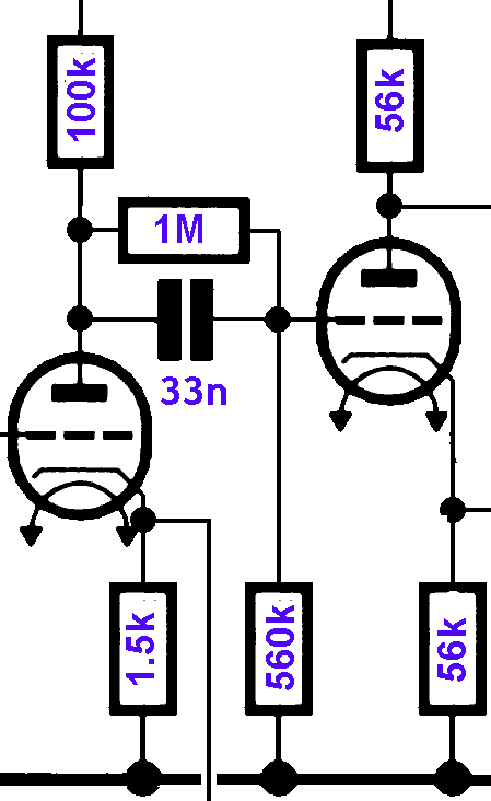 Sommige fase-omkeertrappen kunnen gebruikt worden zonder koppelcondensator als de anodespanning van de voortrap laag genoeg is (ongeveer 100V). Dit is de reden van de relatief hoge anodeweerstand van 180kΩ. De anodespanning van de eerste buis bedraagt ongeveer 1/3 van de hoogspanning, en dit is een geschikte spanning op het rooster van de fase omkeertrap.