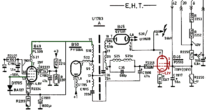 Een klein deeltje van de hoogspanningsvoeding voor de beeldbuis in een Philips KTV. Er is een tweede PL509 en een tweede PY500 op de transfo aangesloten (beide buizen werken in parallel, niet in push pull). De diode voor het gelijkrichten van d ehoogspanning is de GY501 en de shunt stabilisator is een PD510.