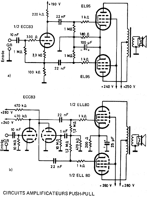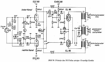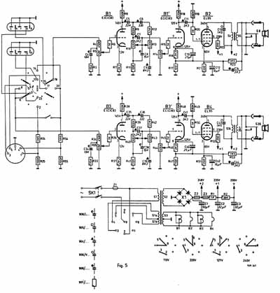Single ended versterker![]() Het vermogen dat één enkele EL95 kan leveren is beperkt tot 1.5W, te weinig om aan de DIN 45 500-norm te geraken (minstens 6W audiovermogen). Men kan zich afvragen waarom Philips een dergelijke versterker op de markt heeft gebracht. Het is waarschijnlijk dat Philips het goedkoop chassis, dat oorspronkelijk in enkele platenspelers gebruikt werd, ook heeft gebruikt in zijn versterkers. Het was het begin van de "hifi" voor het grote publiek en deze versterker kon goedkoop gemaakt worden. De volumeregeling heeft een loudness correctie, dit was gebruikelijk in die tijd. De loudness verhoogt de bassen bij laag volume omdat de luidsprekers wat zwakjes waren wat betreft de lage tonen. De lage tonen ook verhogen bij normaal volume is niet aangeraden, want de versterker is beperkt wat het vermogen betreft. Er is een passieve toonregeling tussen de twee triodes, gevolgd door een balansregeling. Heeft men de toonregeling niet nodig, dan kan ook een triode vervallen. De outputbuis van deze versterker is weinig krachtig. Men moet best de kleine condensator van 1.5nF verwijderen (over de primaire audiotransformator), daardoor worden de hoge tonen te veel onderdrukt. Er is een normale tegenkoppeling naar de cathode van de voorversterkertriode. De twee audiotransformatoren zijn bijzonder klein uitgevoerd zodat er geen vermogen verloren gaat in het magnetiseren van de ijzerkern, maar dat betekent ook dat de bassen zwak zullen zijn. De audiokwaliteit in het middengebied is goed, maar de bassen zijn te zwak en de demping is te laag. De hoge tonen zijn onvoldoende aanwezig en men moet de hoge tonen regelaar op maximum zetten. De geluidkwaliteit is voldoende voor een kleine slaapkamerversterker (de lampenversterker in mijn slaapkamer heeft een vermogen avn 15W...). De constructie is degelijk en er is weinig brom hoorbaar. Enkele jaren later zal Philips overschakelen op transistorversterkers met germanium transistoren. De kwaliteit van die versterkers was slecht, al was het vermogen hoger. Met deze buis kan men echter wel een goed klinkende balansversterker bouwen. ![]() Push pull versterkerDe versterker gebruikt een gemeeenschappelijke cathodeweerstand voor de voorspanning van de eindtrappen. Men zou ook een negatieve roostervoorspanning kunnen gebruiken (-13V), maar de vermogenswinst die men kan halen is heel beperkt. Het maximaal vermogen is beperkt door de maximale cathodestroom van 35mA en de maximale anodedissipatie van 6W.Er is een fout in de schakeling: de twee weerstanden (anode en cathode van de cathodyne moeten dezelfde waarde hebben zodat men dezelfde amplitude heeft op beide uitgangen van de fase omkeertrap. Kies twee weerstanden van 150k. De versterker heeft een voortrap nodig: de amplitude aan de ingang van de fase omkeertrap moet 9Veff bedragen om het maximaal vermogen te halen. Men kan een halve ECC83 gebruiken en een tegenkoppeling voorzien van het secundair van de audiotransfo naar de cathode van de voortrap. De tweede schakeling op dezelfde pagina uit het boek gebruikt een ELL80. De buis heeft twee beam tetrodes (straalbundel tetrodes) in één ballon. Indien ik deze buis hier vermeld, is dat omdat deze buis zeer zeldzaam geworden is en men kan adapters kopen waarin men twee EL95 kan plaatsen. De adapter met de twee EL95 wordt dan geplaatst in de buisvoet die voorzien was voor de ELL80. Er is een grote hoeveelheid EL95 buizen, terwijl de hoeveelheid werkende ELL80 beperkt is. De ELL80 werd gelanceerd op het einde van de buizenperiode en men was al bezig de buizen te vervangen door transistoren. Het rendement van een ELL80 (beam tetrode) ligt wat hoger dan die van een EL95 (pentode), maar in de praktijk is de aanpassing probleemloos. Men kiest de cathodeweerstanden naargelang de hoogspanning: 180Ω voor 250V en 200 of 220Ω voor 280V. De fase omkeertrap is een parafase, een minder vaak gebruikte schakeling. Alle pagina's die in november 2022 online zijn gezet krijgen een link naar de internationale shooting days, dit is een event waar fotografen en modellen uit verschillende landen samenkomen. De site bevat praktische informatie (lokaties, planning,...) en is aangepast voor smartphones en tablets. ![]() Simplex/stereoplex versterkerDe EL95 werd doorgaans gebruikt in goedkopere toestellen, dus waarom niet in een simplexschakeling? Met een dergelijke schakeling heeft men een stereo push pull versterker met de helft van de buizen.Op het eerste zicht lijkt de versterker normaal, met twee single ended versterkertrapen die elk een eigen luidspreker aansturen. Maar dan merkt men dat de luidsprekers enkel voorzien zijn voor de mid en hoge tonen. Voor de lage tonen werken de twee versterkers als één balansversterker. Twee kleine condensatoren van 0.1µF filteren de hoge tonen. Om een echte push pull versterker te hebben, moet een kanaal omgekeerd aangestuurd worden, dit gebeurt door de triode EABC80. Bij een mono werking gebruikt men enkel het linker kanaal als bron en de fase omkeertrap is nodig zoals in nagenoeg alle balansversterkers. Wegens de fase omkeertrap is de betreffende luidspreker voor de hoge tonen omgekeerd aangesloten. Ik heb testen gedaan met een stereoplex versterker met een paar PCL805 die een hoger vermogen kunnen leveren dan de EL95 die hier gebruikt worden. Het vermogen dat men bekomt is lager dan met een echte push pull versterker. De kanaalscheiding is ok tot men aan het maximaal vermogen komt. De schakeling hier heeft een hoger rendement dan mijn eigen schakeling en gebruikt twee aparte tweeter/mid luidsprekers en een bassluidspreker. De eindtrappen moeten noodgedwongen in classe A werken want de hoge tonen/midrange luidsprekers worden single ended aangestuurd. |