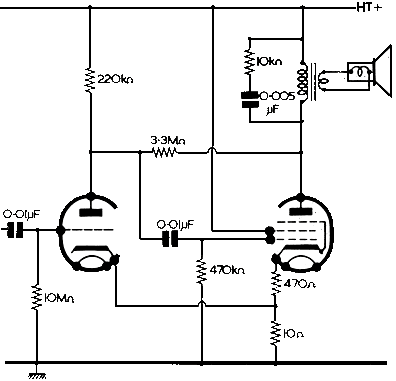 De schakeling is een goedkoop ontwerp zonder elko's: als de cathodeweerstand van de eindtrap niet ontkoppeld wordt stijgt zijn uitgangsimpedantie, dat we dan gedeeltelijk ongedaan kunnen maken door de tegenkoppeling. De cathode van de voortrap krijgt een lichte positieve spanning via de weerstand van 10Ω. Dit veroorzaakt echter een kleine positieve tegenkoppeling. In versterkers moet men degelijke ingrepen vermijden, dit kan de versterker onstabiel maken en/of slecht doen klinken als de parameters van de onderdelen verlopen. De correcte oplossing is een ontkoppelelko van 100µF te gebruiken voor de eindtrap en een aparte weerstand en elko (1kΩ + 50µF) te voorzien voor de roosterpolarisatie van de voortrap. Een mono-versterker met ECL82 staat hier, de versterker is echter aangepast voor spraaktoepassingen. De splinternieuwe ECL82 werd ook gebruikt in een Stereoplex schakeling (een stereo balansversterker met de helft van de buizen): met een triode en een pentode in eenzelfde buis werd de trend gezet naar versterkers met minder buizen.