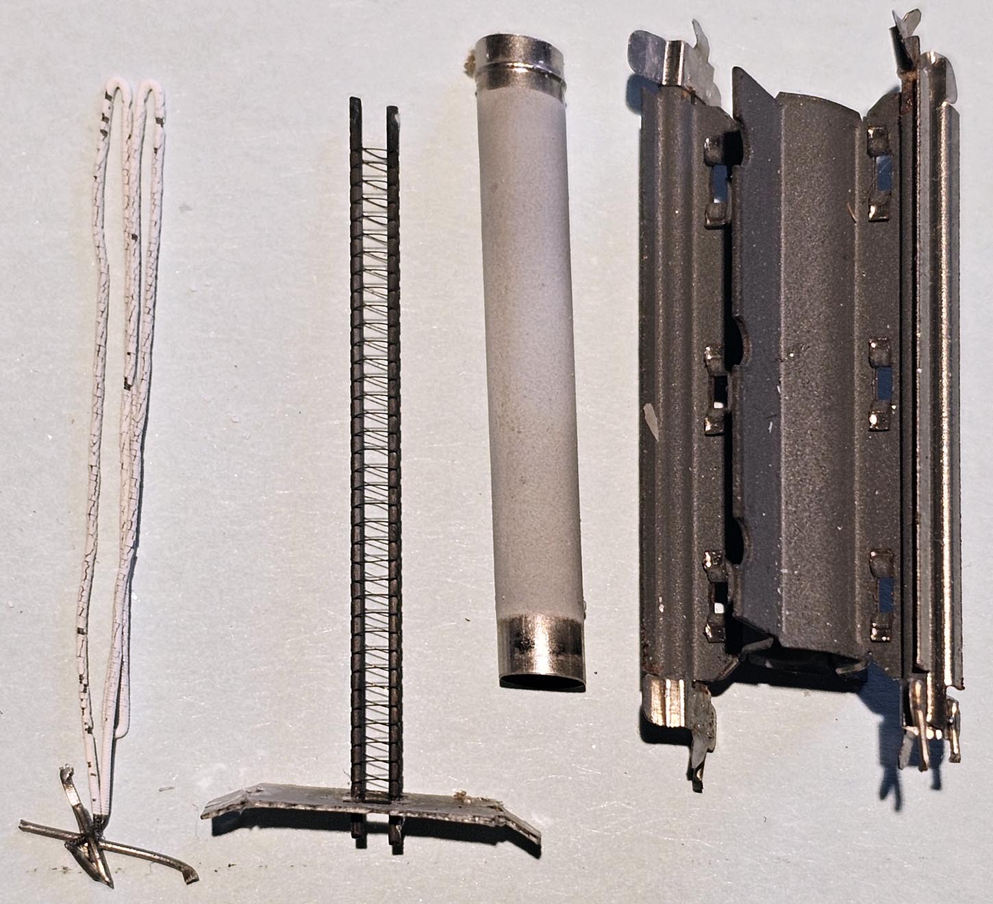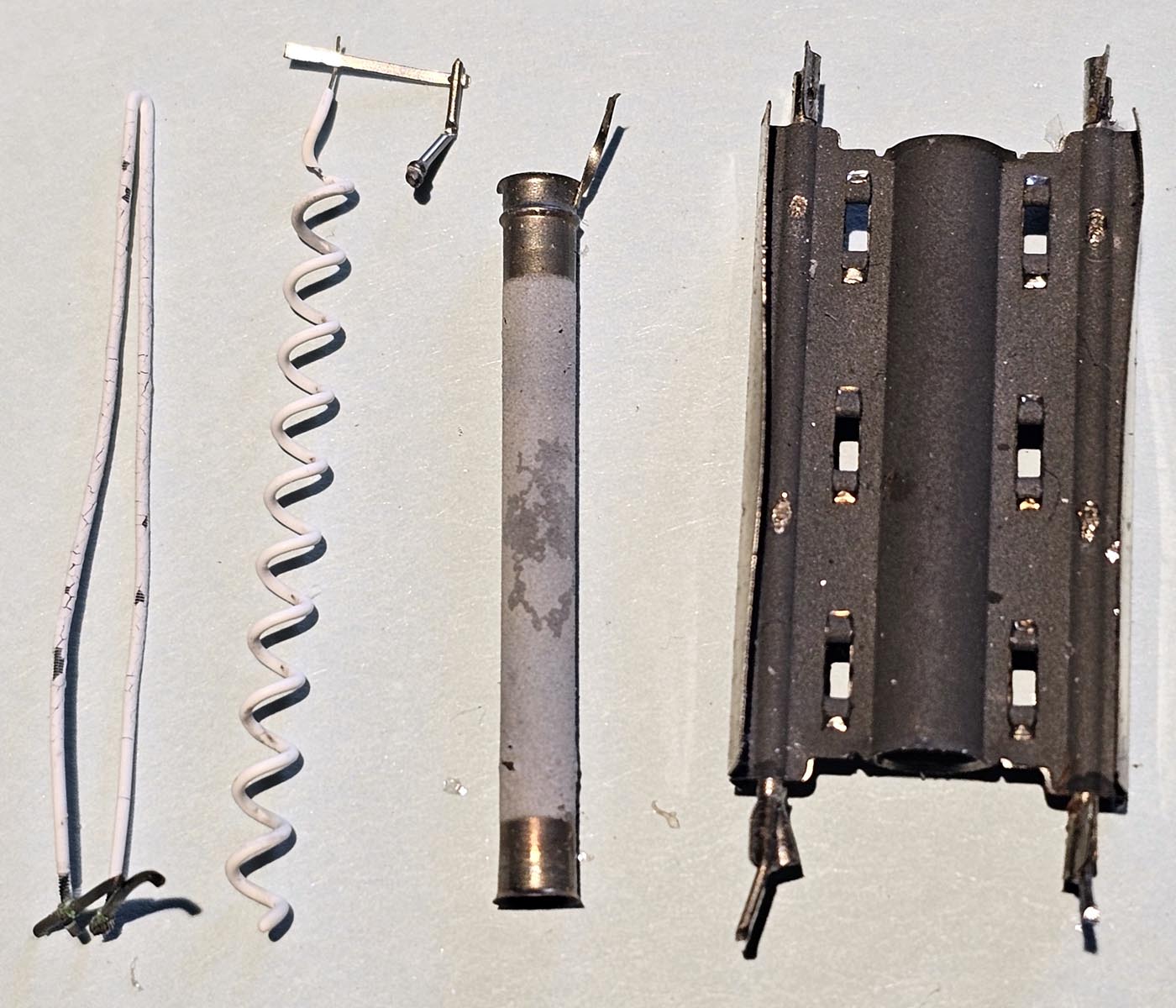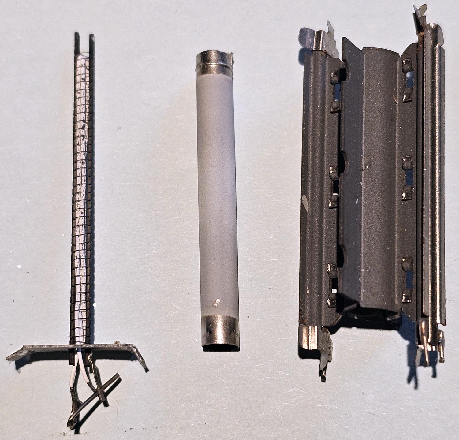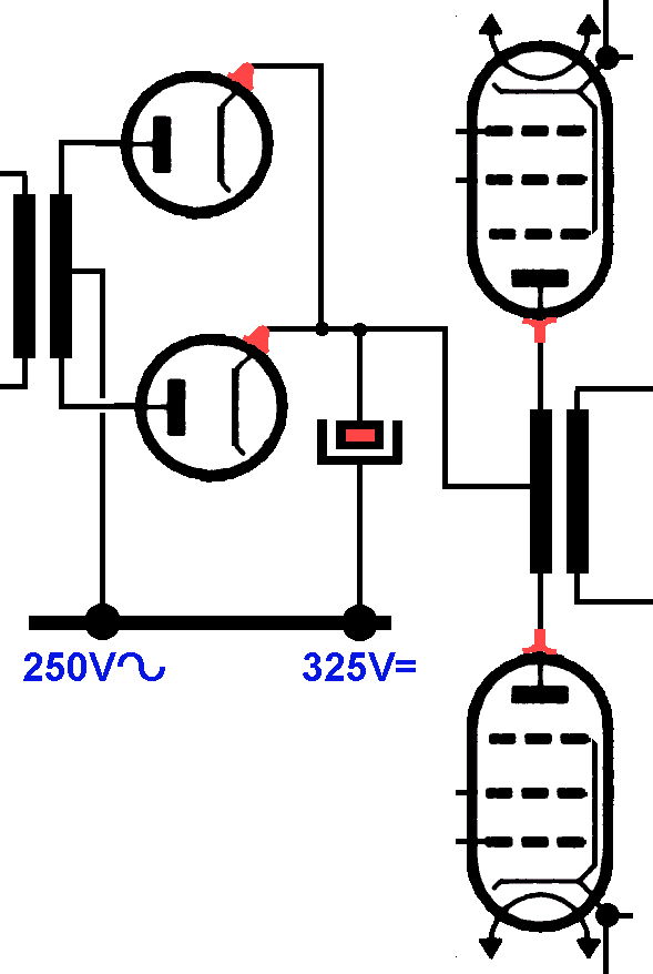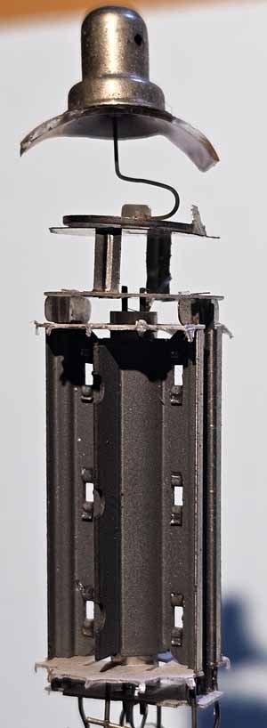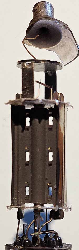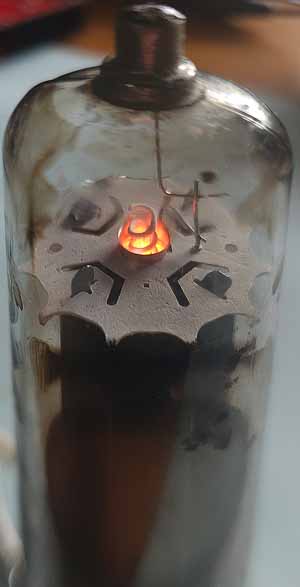 De eerste afbeelding rechts toont een PY85 (vrij zeldzaam) en de tweede een PY88. De kathode is verbonden met de aansluiting bovenop de buis. ![]() PY85 Een diode heeft niet veel elementen: een kathode, een anode en natuurlijk een gloeidraad om de kathode te verwarmen. De gloeidraad is in het midden van een isolerende spiraal om te voorkomen dat deze de kathode raakt. De cilindrische kathode is erg breed in vergelijking met een normale kathode: dit zorgt voor voldoende afstand tussen de gloeidraad en de kathode. De anode is ook rond. ![]() PY88 De PY88 is een recentere versie, die vanaf de jaren 60 in alle monochrome televisies wordt gebruikt. Deze diode maakt een iets hogere stroomsterkte mogelijk. De anode is ook rond, maar heeft twee extra koelribben. De diode heeft een klein micaplaatje aan de onder- en bovenkant om twee staafjes vast te houden die een gaas vormen. Hier wordt het filament beter op zijn plaats gehouden; het zit in het gaas geklemd. De tweede foto toont het filament buiten het gaas.