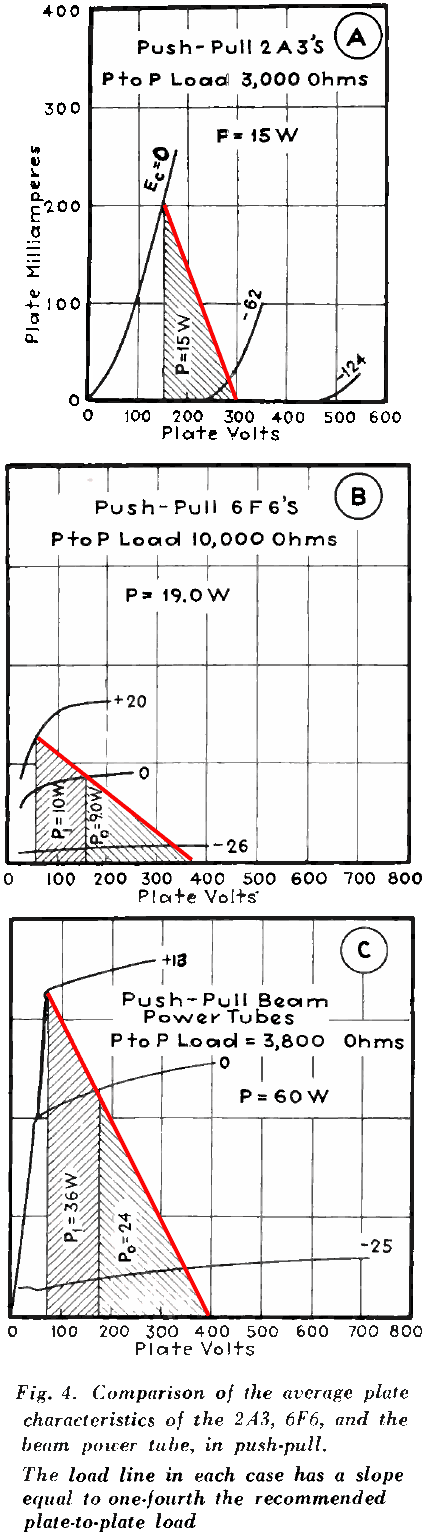 Pentode: 6F6De 6F6 is de typische pentode die gebruikt werd voordat men overstapte op beam tetrodes in de Verenigde Staten. De pentode heeft een hoge inwendige weerstand, waardoor men ook een transformator moet kiezen met een hogere impedantie. De belastingslijn is daardoor meer horizontaal.Men merkt dat de curves veel krommer zijn, dit wordt veroorzaakt door de wikkelingen van het keerrooster. Het keerrooster moet losjes gewikkeld worden zodat er voldoende primaire electronen de anode kunnen bereiken. Dicht bij de wikkeling is de invloed van het rooster sterker en verder af van de wikkeling is zijn invloed minder. Daardoor verandert de versterking geleidelijk en is de kromme meer krom. De kromme curves veroorzaken echter vooral even harmonischen, die goed onderdrukt kunnen worden door de symmetrische push pull configuratie. Als het stuurrooster niet positief mag worden, dan haalt men een vermogen van 9W in een push pull versterker. Laat men de roosterspanning positief worden, dan is er een extra drivertrap nodig om de pentode volledig uit te sturen (het stuurrooster gedraagt zicht dan als een kleine anode en heeft stroom nodig). In werkingsclasse A2 komt er dan nog 10W bij zodat het totaal vermogen 19W bedraagt.