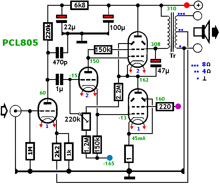 Ik heb echter een Peterson-Sinclairschakeling gevonden op het internet. De schakeling is tegenwoordig niet meer bruikbaar omdat die gebruik maakte van vermogenstriodes die nu bijna niet meer te vinden zijn. Maar delen van de schakeling kunnen gebruikt worden in een modernere versie van de schakeling, dus met beam tetrodes. Zoals in de Peterson-Sinclairschakeling gebruik ik een directe sturing van de eindtrappen (dus zonder koppelcondensatoren). We hebben dus een spanning van -160V nodig. De juiste polarisatiespanning wordt over de onderste 150kΩ weerstand van de cathodyne ontwikkeld. Er is dus een tweede 150kΩ weerstand nodig (anodeweerstand). Het lijkt een zeer complexe schakeling, maar er zijn minder onderdelen nodig in vergelijking met de klassieke SRPP schakeling met PCL805. De schakeling is min of meer zelfinstellend met de juiste keuze aan componenten. Ik gebruik hier ook een paar PCL805 rastereindtrappen (beam tetrodes) die op hun gemak zijn met een lagere anodespanning en een hogere stroom. Naargelang het gekozen werkpunt heeft de tetrode een spanning nodig van -20V op zijn stuurrooster (classe AB) tot -13V (classe A). We hebben dus ongeveer 150V over de onderste weerstand van 150kΩ en we moeten dezelfde spanningsval terugvinden over de bovenste weerstand. De anodespanning van de cathodyne bedraagt ongeveer 150V, en dat is ook de spanning op het stuurrooster van de bovenste tetrode. Om een correcte werking te hebben die overeenkomt met die van de originele SRPP schakeling moet de andere kant van de anodeweerstand van de cathodyne op de hoogspanning aangesloten worden (310V), maar moet de wisselspanning er ook op gesuperpondeerd worden. De enige plaats waar een dergelijke spanning te vinden is, is op het schermrooster van de bovenste tetrode. Er is een meetweerstand van 1Ω in de cathodekring om de ruststroom door de eindtrappen te meten (instellen op ongeveer 20mA in rust). De instelling van de ruststroom gebeurt met de trimmer van 220kΩ. Deze spanning stelt de spanning in van de cathodyne, die op zijn beurt de instelstroom van de onderste tetrode instelt. De ruststroom van de tetrodes moet zeker ingesteld worden, en de instelling moet opnieuw gebeuren bij het vervangen van de buizen. Dit hoort bij alle versterkers die in classe AB werken.