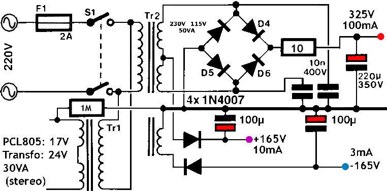 VoedingEr wordt gestreefd om met standaard transformatoren te werken. Voor de hoogspanning gebruik ik een scheidingstransfo of verhuistransfo met drie 115V uitgangen, zodat ik een hoogspanning van 320V bekom. Er is 100mA nodig voor een stereo versterker.De middenaftakking levert de +160V (schermroosterspanning, 7mA stereo) en de laatste wikkeling de -160V (polarisatiespanning, 3mA stereo). Een 50VA transfo is dus voldoende. De gloeispanning wordt verkregen door middel van een tweede transfo van 24V. Ieder buis heeft een gloeispanning van 17 à 18V nodig. Indien men de spanning gelijkricht en filtert (minstens 2200µF) dan bekomt men een spanning van 33 à 34V, goed om twee buizen in serie te voeden. Met 48V worden alle 4 buizen in serie gevoed. De "lage" buizen (1 op de schakeling) moeten gevoed worden met de lage kant van de gloeispanning. De werking van de schakeling is misschien niet zo duidelijk: de werking van de originele SRPP schakeling van MBLE staat hier uitgelegd. De originele Peterson-Sinclairschakeling (met vermogenstriodes) staat hier uitgelegd. |