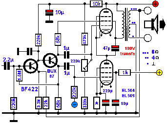 Op de pagina van de negatieve voedingsspanning staat nog een voorbeeld van een SRPP versterker (met negatieve stuurroosterspanning van de output tetrode). Dit is nog een voorbeeld van een andere schakeling, hier met ECF80 en EL508.