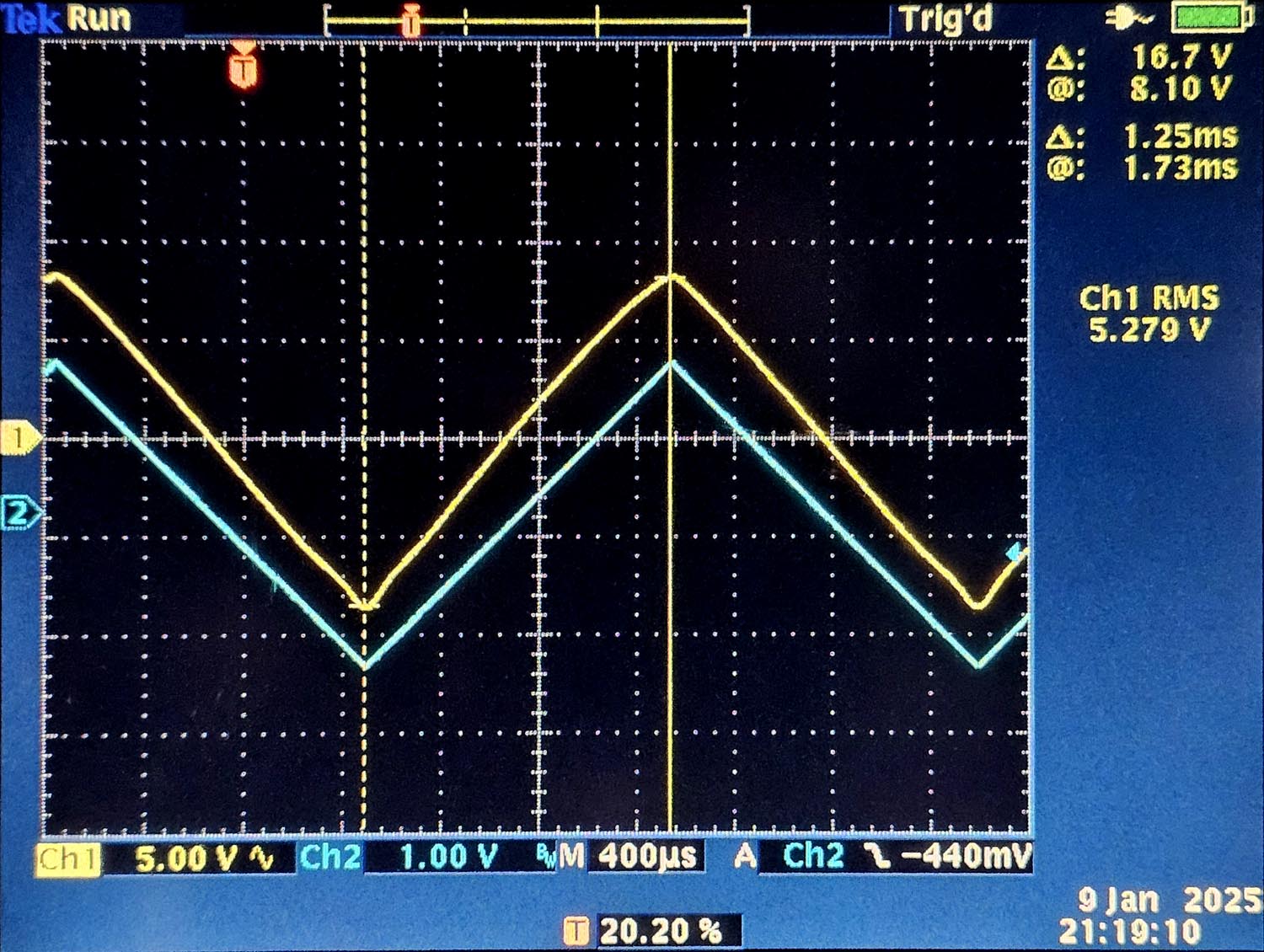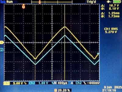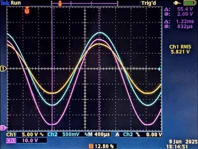 Het eerste skoopbeeld toont dat de anodespanning niet meer zo laag kan geraken, de minimale anodespanning bedraagt 54V. We zien ook een begin van vervorming, die beter zichtbaar is met een driehoeksignaal. Met een driehoeksignaal kan je eigenlijk geen metingen doen (sinus: vermogen, blokgolf: uitslingering) maar vervormingen worden extreem zichtbaar.