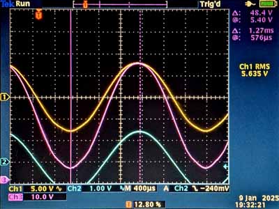 Rechts een skoopbeeld van de signalen zonder enige vorm van tegenkoppeling (ingangsignaal van 65mVeff). We zien echter dat de sinus niet echt mooi is (veel even harmonischen). De top is boller en de onderkant is spitser, een teken dat de buis gemakkelijk meer stroom had kunnen leveren.