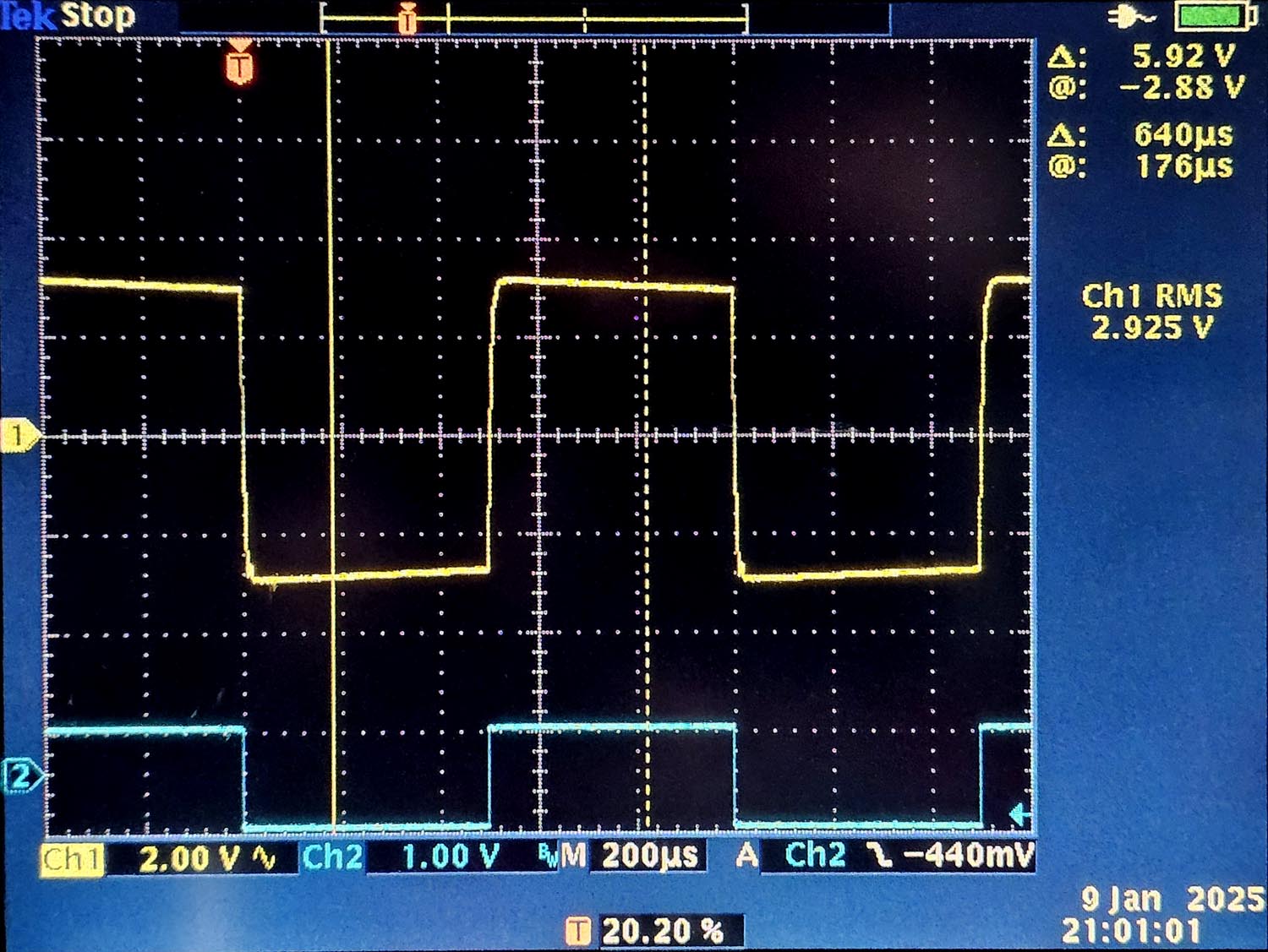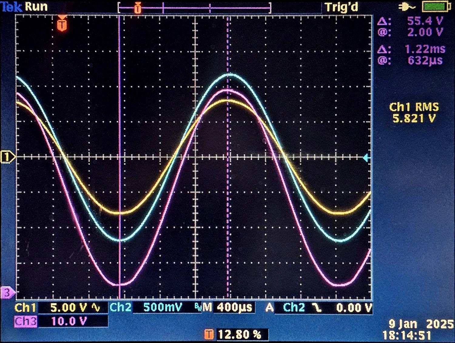 Bij het tweede skoopbeeld zie je iets bijzonder, ik heb namelijk de anodespanning gemeten (met een 10:1 probe want we hebben een spanningszwaai van 554V en dat is best veel voor de skoop).