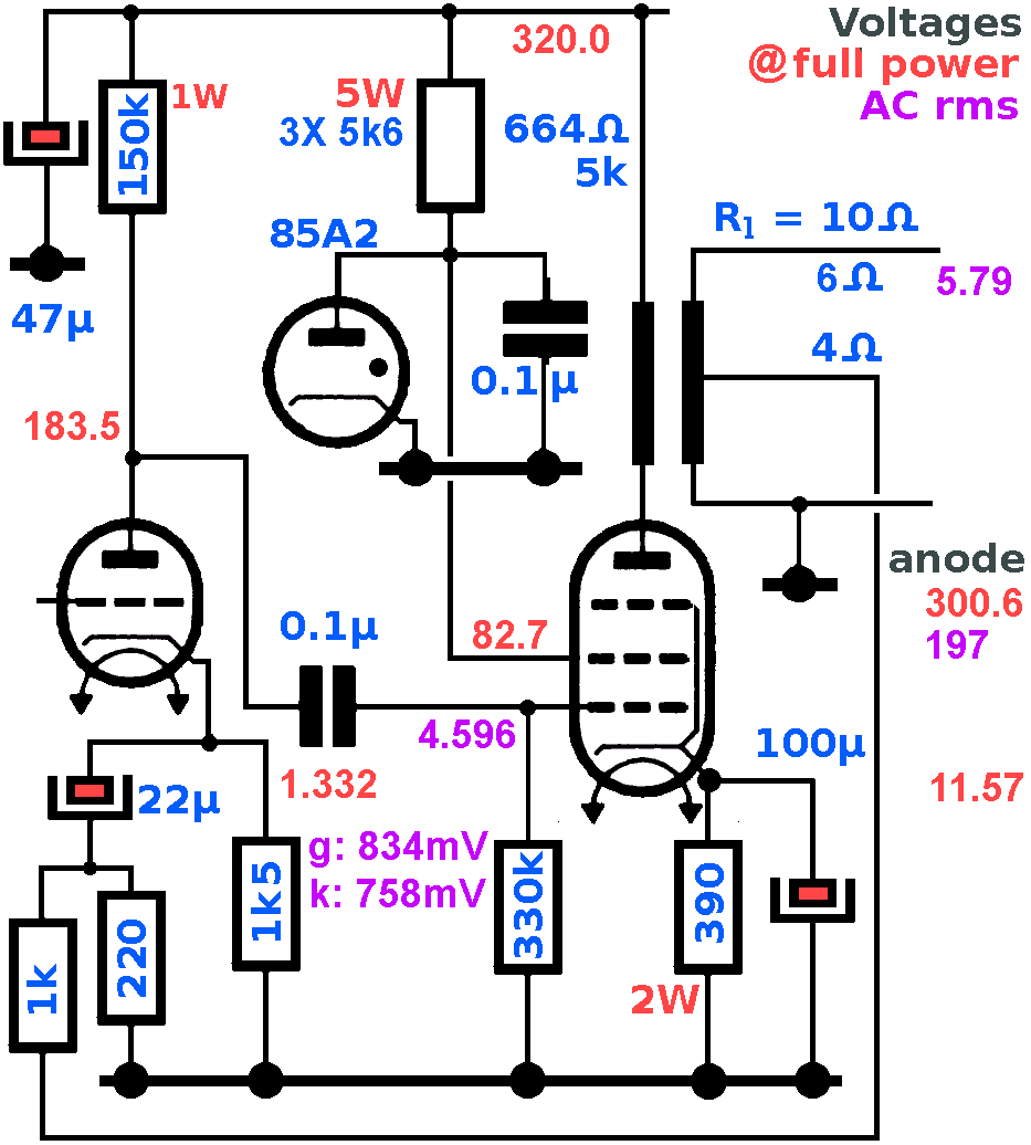 De tetrode heeft een schermroosterspanning van 82.7V, en is dat gewoon perfect. Met een hogere schermroosterspanning komt het slecht karakter van de buis naar boven en uiteindelijk halen we een lager vermogen als we de schermroosterspanning verhogen (stabilisatorbuis OA2 van 150V). Het is aangeraden de schermroosterspanning te stabiliseren met een 85A2 zoals in dit voorbeeld. De bleederweerstand van 3×5.6kΩ dissipeert in totaal meer dan 3W en je gebruikt best drie weerstanden van 2W.
