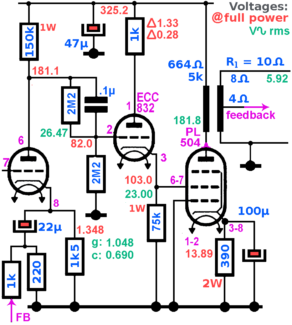 Zonder tegenkoppelingMet een normale sinus signaal (zie skoopbeeld bovenaan de pagina) is de vervorming zeer laag, zelfs zonder tegenkoppeling, maar dan moet men absoluut een lage schermroosterspanning gebruiken (zie schakeling boven).Met een sturing op het schermrooster hebben we nog minder vervorming (zonder tegenkoppeling), maar we hebben een voortrap die een hoge versterking kan leveren. Hier is de tegenkoppeling zeer laag (8.3dB), want we hebben weinig reserve. Eventueel een PCL80 gebruiken als voortrap (pentode) en driver (triode) in plaats van een ECC832. Met een ECC82 of ECC83 werkt de schakeling trouwens niet goed.