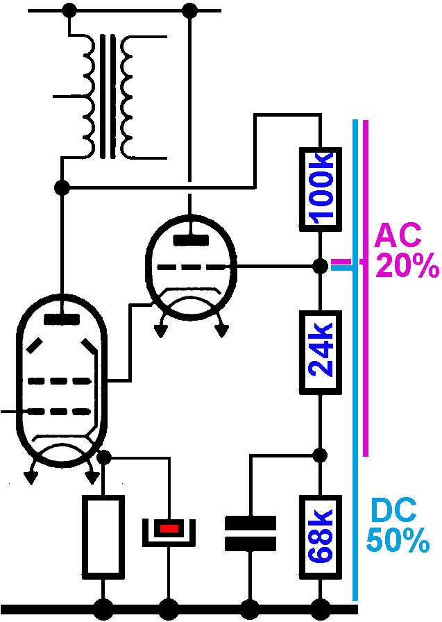 Ultra lineaire schakeling met normale output transfo en extra triode![]() Wil je liever een single ended schakeling bouwen, dan kan je het bovenste deel van de schema wissen (behalve de transfo). De ultra-lineairschakeling is veel beter op zijn plaats bij een single ended versterker. De waarde van 24kΩ is hier de juiste waarde omdat de anode van de triode verbonden is met de hoogspanning.