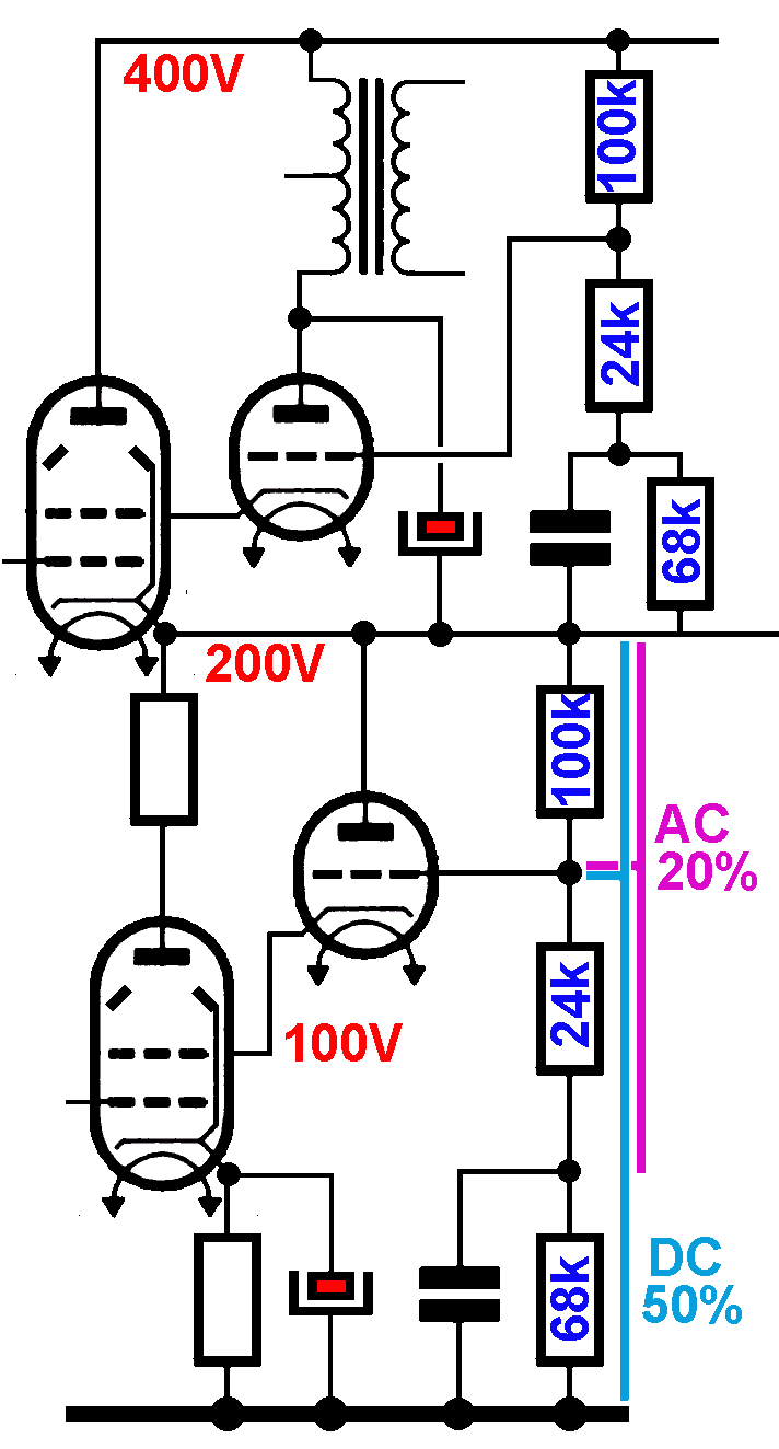 Een andere buis die we kunnen gebruiken is de PL504, dit is ook een buis die de beste eigenschappen heeft bij een relatief lage g2 spanning. We kunnen de anodestroom verhogen tot 50mA. De drie weerstanden in de spanningsdeler worden 10k, 4.7k en 22k. Triode en pentode parallel geschakeldEen andere manier om een ultra lineaire schakeling te bouwen zonder speciale transfo is gebruikt te maken van twee beam tetrodes of pentodes die parallel geschakeld zijn, de ene is triode-gekoppeld (blauwe tetrodes), terwijl de twee andere buizen pentode-geschakeld (rood) zijn. Dit is een schakeling die gepropageerd werd door Igor S. Popovich.Zoals de ultra lineaire schakeling die een beter resultaat levert dan een pentode of triode schakeling, levert deze schakeling ook een beter resultaat, maar dat valt niet op als je de schakeling bekijkt. De negatieve voorspanning is zodanig ingesteld dat de triode-geschakelde buizen in classe A werken, terwijl de pentode-geschakelde buizen in classe AB werken. Hoe dit bekomen wordt, wordt uitgelegd op de pagina over de classe A + classe B werking. Op een laag volume zijn het vooral de triodes die vermogen leveren: men heeft dus de goed eigenschappen van de triodes, eigenschappen die nog verbeterd worden door de werking in classe A. Bij een hoger vermogen zijn het de pentodes die de overhand hebben omdat ze geen lokale tegenkoppeling hebben (anode naar schermrooster). De versterker kan zo een hoog vermogen leveren, en toch klinken als een triode-versterker. Men kan hier alle types buizen gebruiken die geen al te goede eigenschappen hebben in pentode modus zoals de 6V6, 6L6, EL504, EL509, EL34,... Het vermogen ligt wat hoger dan een montage met enkel een dubbele pentode, maar de vermogenswinst die door de extra triodes geleverd wordt is beperkt. Het is goed mogelijk andere buizen te gebruiken voor het triode en pentode deel. Om buizen met een sterke lokate tegenkoppeling aan te sturen hebben we een hogere sweep nodig want de versterking van de eindbuis wordt beperkt: de cathodyne mogen we vergeten, de long tail schakeling is al wat beter. Maar de beste schakeling is de Williamsonschakeling als fase omkeertrap (we hebben een ECC83 als voortrap en cathodyne en een ECC81 of ECC82 als drivertrap). De Williamson schakeling heeft een hoge versterking, een relatief lage en constante uitgangsimpedantie op beide uitgangen en een hoge sweep. Daarmee compenseren we de magere versterking van bijvoorbeeld de PL504 pentodes. We kunnen hier zelf een beperkte globale tegenkoppeling toepassen. Alternatieve ultra lineaire schakeling met extra triodeEn nog een alternatieve ultra lineairschakeling, nu in een SRPP schakeling. De eindtrap is hier bijvoorbeeld een EL504 en de triode een ECC81. Van de srpp tekenen we enkel de eindtrap, je kan hier kiezen voor een polarisatie door cathodeweerstand of met een negatieve spanning.De beam tetrodes werken best met een beperkte tegenkoppeling van 20% en de schermroosterspannning wordt ingesteld op ongeveer 50% van de anodespanning. De niet gepolariseerde condensatoren beperken de tegenkoppeling tot ongeveer 20%. Omdat de triodes een sterke invloed hebben van de anodespanning kan de weerstand van 24k gerust gebracht worden op 27kΩ. Dit is een voorbeeldschakeling, want het heeft weinig zin een ultra lineaire schakeling te gebruiken met een SRPP schakeling die zeer weinig vervormingen geeft.