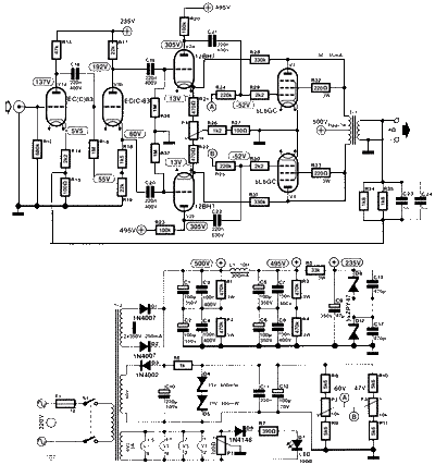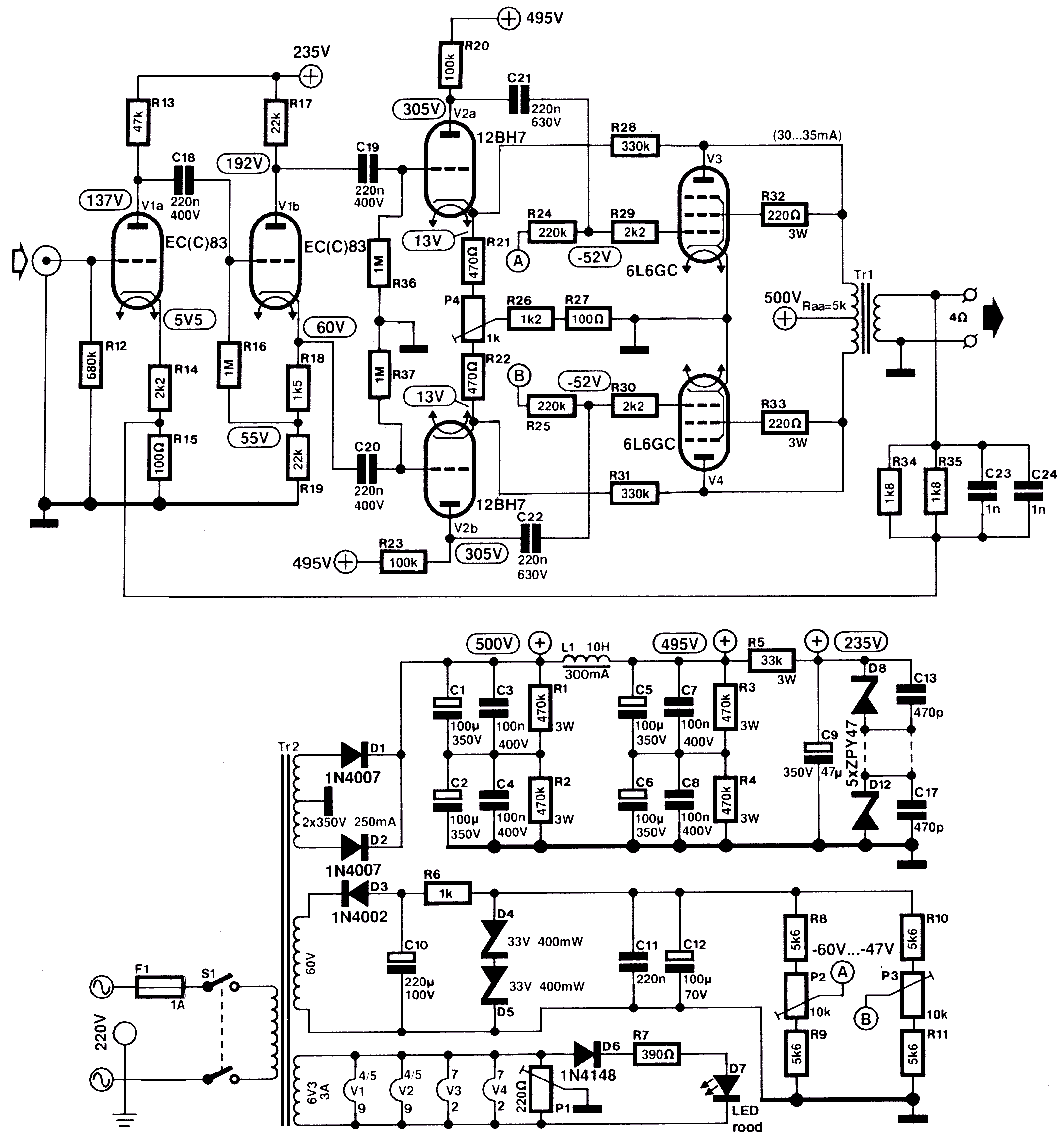 6L6 in Self Inverting Push PullDe tweede schakeling is een SIPP configuratie (self inverting push pull), de 6L6 kan echt voor alles gebruikt worden. Na de tweede wereldoorlog had men een enorme voorraad 6L6 over omdat de buis voor veel toepassingen gebruikt werd. De buis was goedkoper dan speciale audiobuizen zoals de KT66. De SIPP schakeling is vooral een goedkoper alternatief op de echte push pull en daar hoort ook een buis die relatief goedkoop gemaakt werd.Met de self inverting push pull schakeling kan men een hoger vermogen halen, zonder dat men extra onderdelen nodig heeft (behalve een tweede eindbuis). Het stuursignal voor de tweede eindpentode komt via de gemeenschappelijke, niet-ontkoppelde cathodeweerstand. De 6L6 heeft een relatief hoog vermogen in single ended configuratie en dat is nodig omdat een SIPP schakeling niet kan werken in classe AB. Een vervorming die door de eerste (aangestuurde) buis opgewekt wordt, wordt overgedragen naar de andere buis. Men haalt een dubbel vermogen ten opzichte van een SE-ontwerp. Met dezelfde werkingsparameters (voedingsspanning en vervorming) bekomt men een vermogen van 5W in single ended, 10W in SIPP en 20W met een push pull met omkeertrap. Ik vraag mij soms af waarom deze buis nog steeds in audio versterkers gebruikt wordt, terwijl de buis nog steeds de kenmerkende tetrodeknik heeft. De kode met één letter geeft aan dat dit een zeer oud ontwerp is en er bestaan buizen die veel betere eigenschappen hebben. Maar de buis is zeer geliefd bij musikanten die guitaarversterkers gebruiken. Moderne buizen (cylindrische vorm) verschillen echter weinig van de KT77 die een buis is voor audiotoepassingen. Een complete versterker met ECF80 als voorversterker en fase omkeertrap en 6L6 als eindtrappen staat hier. Daarmee combineert men de hoge versterking van een pentode met de lage inwendige weerstand van de triode in één enkele combi buis. Versterker van ElektuurDe eerste triode van de ECC83 is de voorversterkerbuis en krijgt ook de tegenkoppeling op zijn cathode terwijl de tweede triode een cathodyne fase-omkeertrap is. De tweede buis is een 12BH7, een buis die men kan plaatsen tussen de ECC81 en ECC82 maar een hogere dissipatie heeft. Beide triodes dienen als driver voor de eindtrap. De anodespanning is bijzonder hoog zodat een voldoende sweep mogelijk wordt.Men zou denken dat we hier te maken hebben met een Williamson, maar de drivertrap is geen long tail maar krijgt een lokale tegenkoppeling op zijn cathode. Waarom is dat goed? De eindtrappen zijn in triode geschakeld, waardoor een veel sterkere drive spanning nodig is. Dat is ook de reden van de anodespanning van 495V voor de drivertrap. De sweep is zelfs zo hoog geworden dat de drivertrap ook sterk bijdraagt tot de vervormingen. Door een extra lokale tegenkoppeling toe te voegen kan men de vervorming van de stuurtrap en eindtrap beperken zonder dat de stabiliteit van de versterker in het gedrang komt. Maar de 6L6 is een straalbundel tetrode die niet goed presteert in triode-schakeling (in ultra lineairschakeling trouwens ook niet). Door de plaatsing van de wikkelingen van het schermrooster in het verlengde van die van het stuurrooster is de invloed van het schermrooster zeer sterk. De 6L6 gedraagt zich hier als een zuivere triode (er zijn mensen die de klank van een triode prefereren). De 6L6 wordt hier niet optimaal gebruikt, met een schermroosterspanning die in rust al veel te hoog is, en die tijdens de muziekpieken een waarde van meer dan 800V kan bereiken. Persoonlijk zou ik de schermroosters aansluiten op een gestabiliseerde spanning van 250V. |