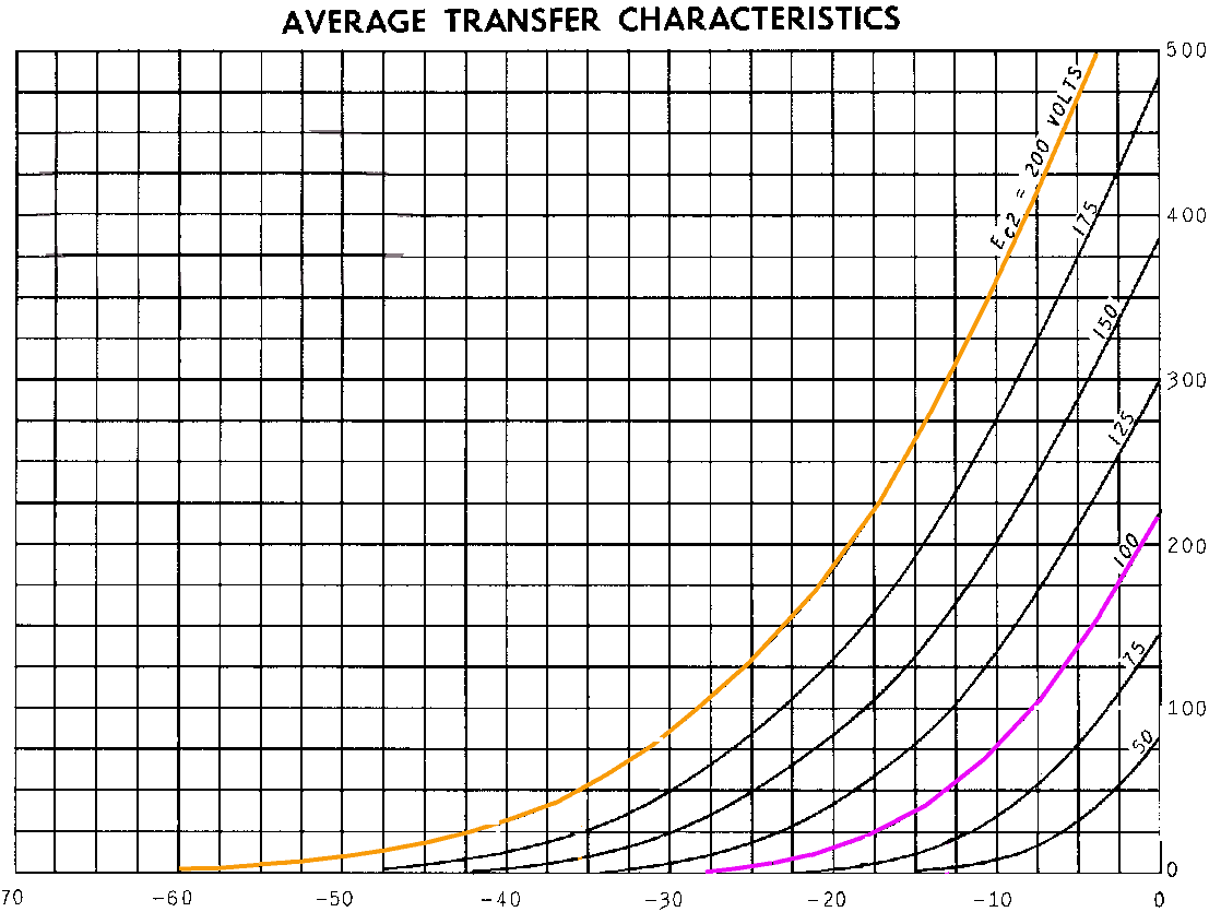 De PCL805 triode-vermogenstetrode (rastereindtrap) is ook een goed candidaat voor een sturing op het schermrooster, kijk hoe equidistant de krommen lopen. De goede eigenschappen blijven behouden met een schermroosterspanning van 100V en een g1 spanning van -15V. Maar de schermroostersturing wordt vooral gebruikt bij single ended versterkers, waar de maximale anodedissipatie het audiovermogen bepaalt. Met een maximale dissipatie van 8W kan men hoogstens een audiovermogen van 2.6W halen, terwijl een PL504 een vermogen van meer dan 5W mogelijk maakt, wat voldoende is voor een kleine stereo versterker. De g2-sturing kan wel toegepast worden bij een push pull schakeling, waarbij de triode gebruikt wordt om de schermroosterstroom te leveren (de triode kan een stroom van 5mA leveren). Men heeft dan enkel een dubbele triode ECC83 nodig om het audiosignaal te versterken en de twee fasen te leveren. Ter info: de lijn A-B geeft het verboden gebied aan: bij een lage anodespanning stijgt de schermroosterstroom boven de toegelaten waarde (maar voor deze limiet bereikt wordt, zitten we al over de maximale dissipatie van de triode). De eerste figuur toont de anodestroom met een vaste stuurroosterspanning (van -1V) en verschillende schermroosterspanningen, op de X-as hebben we de anodespanning. De tweede figuur toont ook de anodestroom, maar nu met een vaste anodespanning en op de X-as de stuurroosterspanning. Men ziet hier ook dat de curves met verschillende schermoorsterspanningen op gelijke afstand van elkaar staan, wat een teken is dat de werking lineair is.