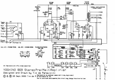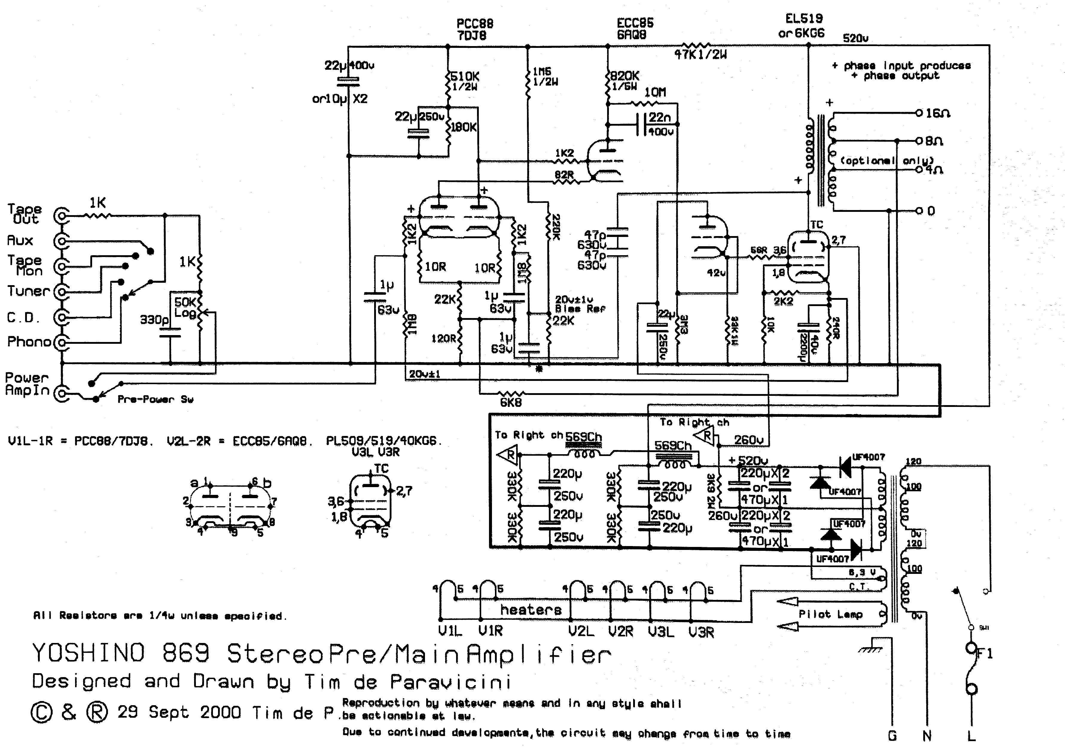 De tweede triode van de long tailschakeling (mullardschakeling) ontvangt de tegenkoppeling. Het principe van de tegenkoppeling zoals die hier toegepast wordt is zeer goed, met een aparte pad voor de hoge frekwenties. De outputtransformator veroorzaakt vaak een fasedraaing voor deze hogere frekwenties en dit effekt wordt optimaal onderdrukt door het signaal af te nemen aan de anode (primair). We hebben vervolgens een ECC85 waarvan de eerste triode het tweede deel van een cathodyneschakeling is, en de tweede triode de drivertrap is voor de eindtrap. De g2-spanning bedraagt hier 42V. De EL519/6KG6 is één van de weinige buizen die voldoende vermogen kunnen leveren in een single ended versterker. De schakeling haalt 15W, vergelijkbaar met het vermogen van een paar EL84 in push pull schakeling. We hebben hier opnieuw een volledige DC schakeling met een gelijkspanningstegenkoppeling om het werkpunt van de eindtrap te stabiliseren. Er wordt in de onderdelenlijst PL509/PL519/40KG6 aangegeven, maar deze buizen hebben een verschillende gloeispanning nodig en hebben dus een aparte wikkeling nodig op de voedingstransfo.