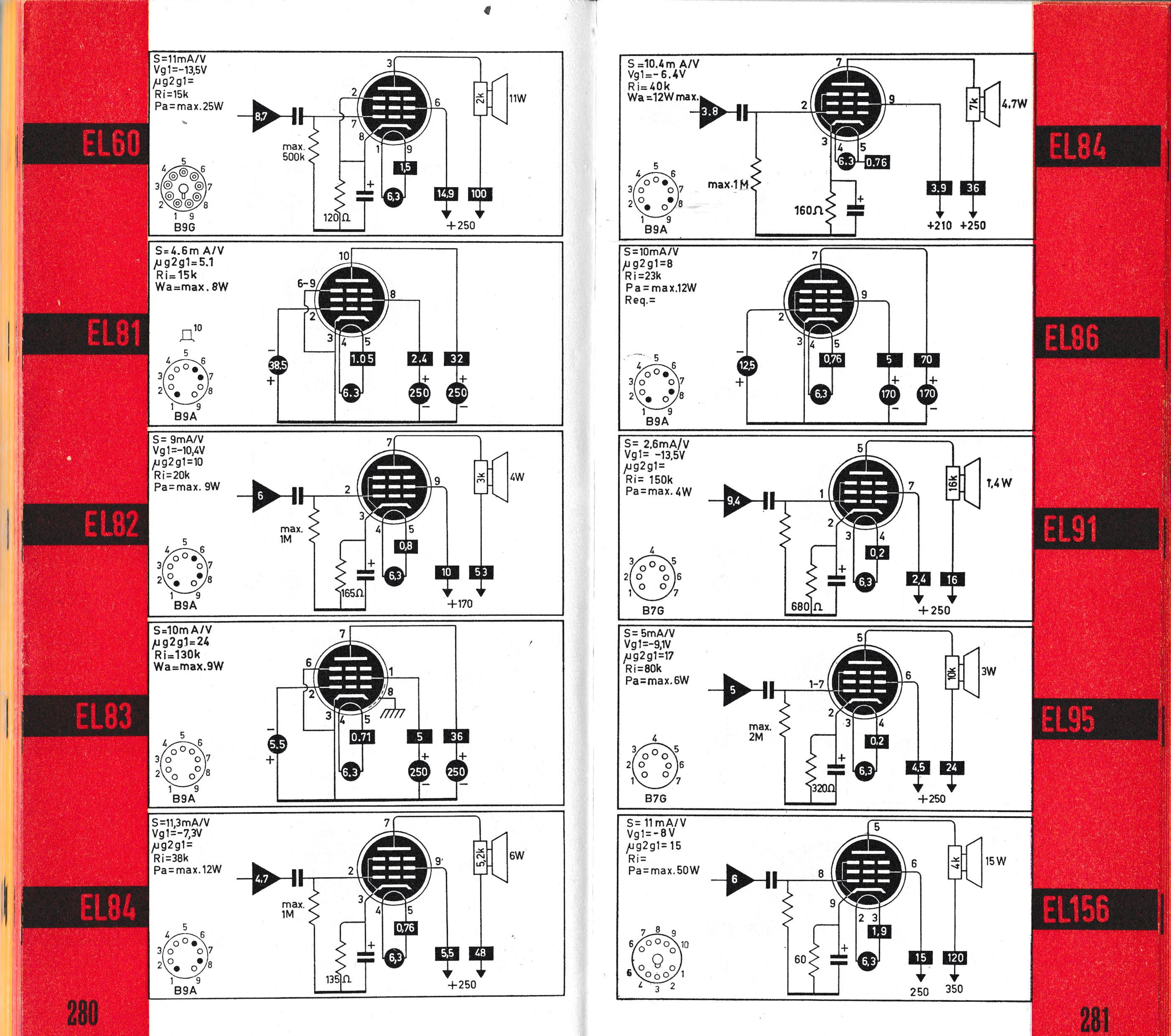 De EL90 (amerikaanse benaming: 6AQ5) komt niet voor in de buizenlijst, terwijl het de meest gebruikte eindbuis was met buisvoet B7G. Het is de europese versie van de 6V6, een beam tetrode. Mocht je een versterker willen bouwen, dan is de EL90 de meest aangewezen buis (hoogste vermogen), je kan de buis zowel single ended als push pull gebruiken. Voor een stereo single ended versterker heb je één extra ECC83 nodig als voorversterker, voor een push pull heb je twee ECC83 extra nodig (voorversterker en fase omkeertrap). Maar in plaats van een EL90 te gebruiken voor een kleine versterker, kan je beter een combi buis gebruiken zodat je geen extra triode nodig hebt. Het vermogen van een versterker met een ECL86 is identiek aan die van een versterker met ECC83 + EL90. Het vermogen wordt aangegeven met een vervorming en de amplitude van het roostersignaal (rms) om tot het aangegeven vermogen te komen. Voor push pull trappen betreft het de spanning tussen de roosters van de twee eindtrappen. Het vermogen moet met een korreltje zout genomen worden, het is muziekvermogen en de vervorming bedraagt in sommige gevallen 10%. Om een single ended stereoversterker te bouwen zijn er twee vermogenspentodes nodig, samen met een dubbele triode zoals de alomtegenwoordige ECC83. Voor een push pull versterker zijn er tweemaal twee vermogenspentodes en een extra fase omkeertrap nodig. De EL156 die ook in de lijst voorkomt is een zeer zeldzame buis, enkel gemaakt door Telefunken voor studio toepassingen (50W versterker). De buisvoet is speciaal (G10A) en wordt niet door andere buizen gebruikt. Opgelet, er is ook een chinese variant van deze buis op de markt met octal buisvoet (deze chinese buis wordt tegenwoordig niet meer gemaakt). We bespreken hier enkel de enkelvoudige pentodes met buisvoet B7G (miniatuur), er bestaan er maar 3 volgens de europese nomenclatuur, maar er bestaan een aantal buizen met miniatuur buisvoet die gebruikt werden in draagbare radio's. Andere buisvoeten en combinatiebuizen: zie indexpagina vermogenspentodes. | |||||||