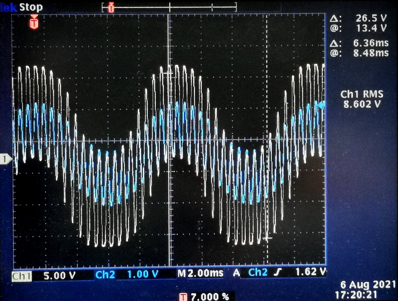 Aan de vorm van het signaal kan men goed zien dat men te maken heeft met een versleten buis: De eindtrap kan het gevraagd vermogen gewoon niet meer leveren, de anodespanning kan bijvoorbeeld niet meer onder de 150V komen, de eindtrap komt te weinig in geleiding. De vervorming is geleidelijk en de versterker klinkt nog redelijk goed. Het is duidelijk geen oversturing, waarbij de vervorming meer lijkt op een clipping, die bij zowel de positieve als negatieve amplitudes kan optreden.