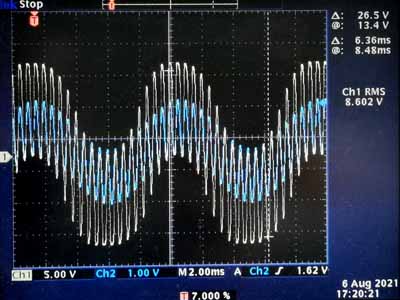 Bij beam tetrodes zoals de KT77, PL504, PL508,... heeft de schermroosterspanning bijna evenveel invloed op de anodestroom als de stuurroosterspanning: een te lage schermroosterspanning heeft eenzelfde invloed als een te negatieve stuurroosterspanning. Er ontstaat crossoververvorming (overnamevervorming) als de andere buis het werk moet overnemen van de ene buis. Let op de rare amplitudeverandering van het uitgangssignaal (in geel). Ook de crossoververvorming gaat mee met het laagfrekwente signaal (dit is zichtbaar aan de verdikking van het oscilloscoopbeeld rond de nuldoorgang).