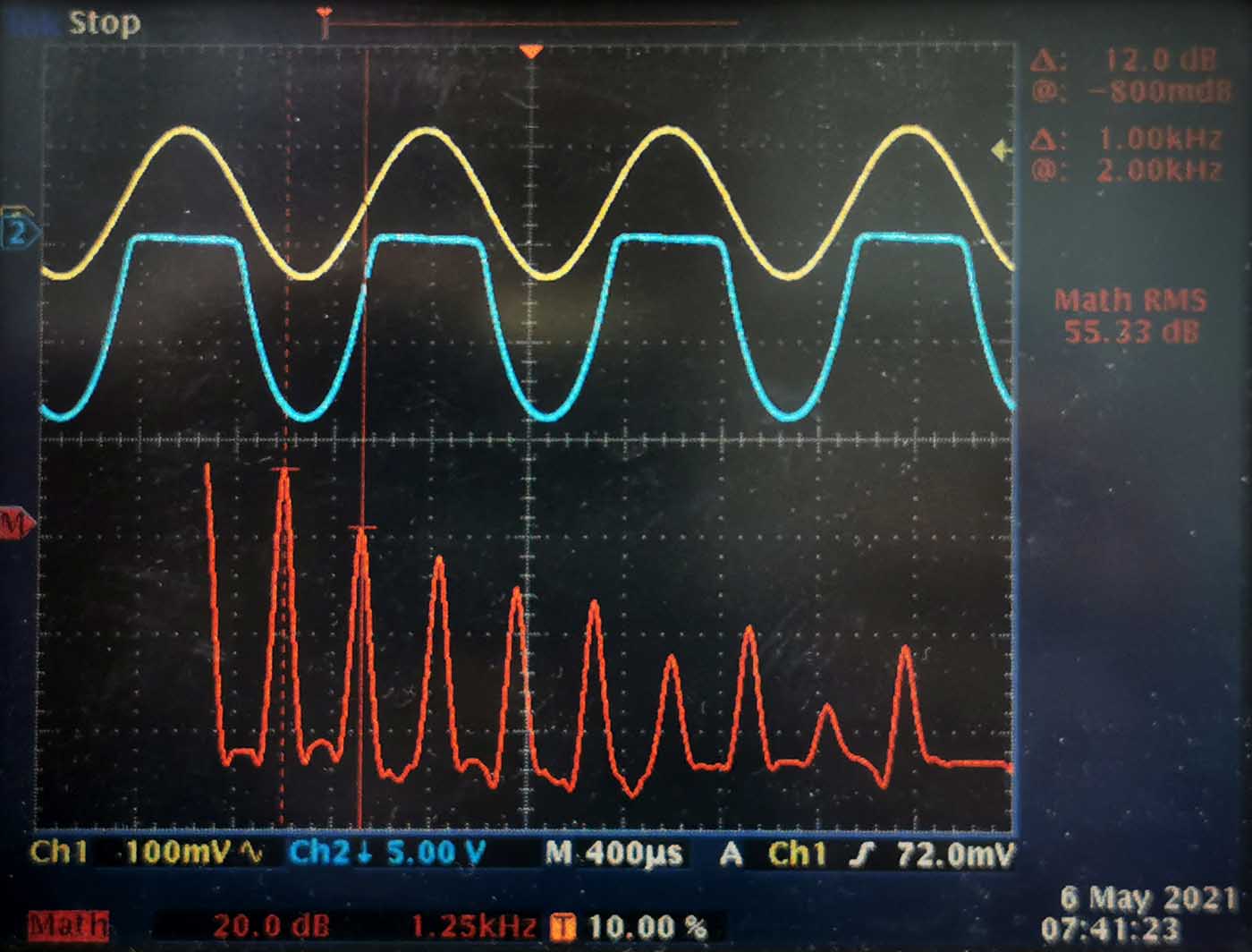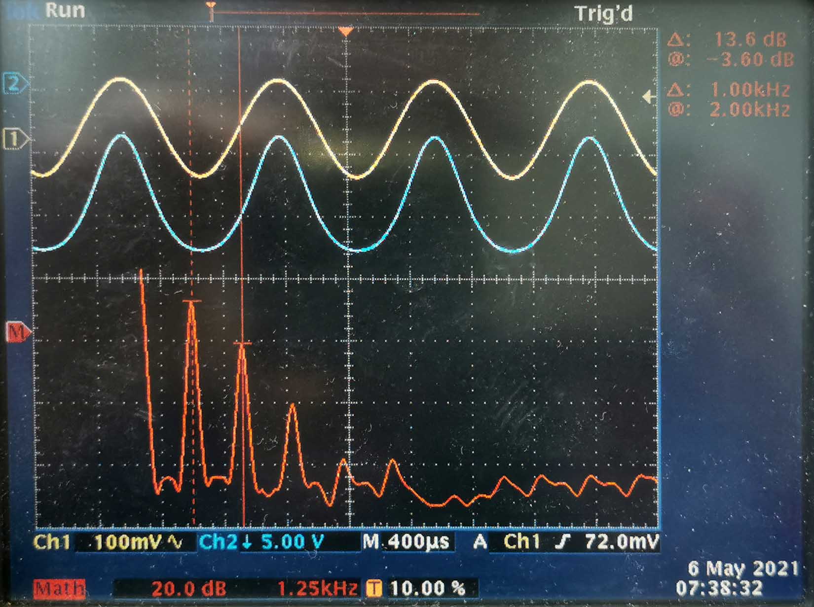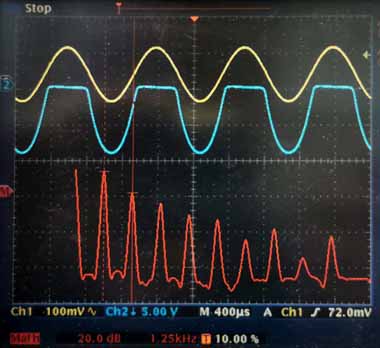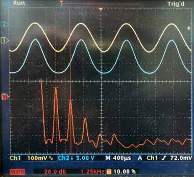 Rekenmodule skoopIk gebruik de rekenmodule van mijn skoop. Ik stuur het signaal van de generator op de ingang A en het uitgangsignaal op ingang B. De versterker wordt belast met een ohmse weerstand van de juiste waarde. De versterker kan getest worden op 1kHz, maar ook bijvoorbeeld op 400Hz en 2.5kHz. Het kan interessant zijn om de evolutie van de vervorming te controleren op verschillende frekwenties.Met mijn systeem kan ik testen uitvoeren met verschillende golfvormen (doorgaans gebruik ik enkel sinus en driehoek), maar de uiteindelijke nauwkeurigheid is beperkt: ik kan geen vervorming meten kleiner dan 0.1%. Er blijft altijd "ruis" hangen (kleine faseverschillen), daarom dat ik bij bepaalde gerealiseerde versterkers moet aangeven "vervorming minder dan 0.1%". Om vervormingen van minder dan 0.1% te meten gebruik ik bij versterkers met tegenkoppeling het signaal op de anode van de triode die de tegenkoppeling krijgt. Omdat ik de mate van tegenkoppeling ken, kan ik ook berekenen hoeveel de vervorming effektief bedraagt aan de hand van dit signaal, die een veel hogere vervorming heeft (het anodesignaal is het correctiesignaal om de vervorming tegen te gaan). Ik toon de twee curves op m'n skoop. De volumepotentiometer wordt op 50% ingesteld. Er komt 500mV RMS toe, de versterker levert bijvoorbeeld een spanning van 10V RMS. Ik regel de skoop zodanig af dat beide traces dezelfde amplitude hebben. De derde trace, dat is een berekende trace, namelijk A - B. Ik regel de volumepotmeter om een zo lage amplitude van de trace te hebben. De rekenmodule moet enkel de vervorming meten, niet de verschillen in amplitude. Ik heb een kleine trimmer om de fasefout te compenseren tussen ingang en uitgang. Deze instelling moet meestal wat gewijzigd worden als er op een andere frekwentie getest wordt. De fout die de versterker veroorzaakt is altijd kleiner dan de fout die gemeten wordt, want verschillende elementen zoals faseverschuiving en amplitudeverschillen vergroten het foutsignaal. Vandaar mijn uitspraak: "vervorming minder dan...". De skoop toont als derde trace de RMS spanning van de berekening. Dit is geen percentage, maar een absolute waarde ten opzichte van ingang B. We veronderstellen een RMS waarde van 50mV: de vervorming bedraagt dus 0.5% (ten opzichte van de 10V uitgangssignaal). Met een beetje ervaring kan ik de vervorming van een versterker met het blote oog schatten door de twee traces A en B over elkaar te laten lopen. Het heeft weinig zin om een vervorming van minder dan 0.1% te halen, luidsprekers hebben doorgaans een vervorming van 0.5% of meer. Een zeer lage vervorming kan slechts gehaald worden door een extreme tegenkoppeling, en die brengt andere nadelen met zich mee. Fast Fourrier TransformDe skoop heeft ook een FFT-mogelijkheid, daarmee zie ik enkel de harmonischen, maar de vervorming is moeilijk te berekenen. Bij een FFT is de horizontale as geen tijdseenheid meer, maar een frekwentieschaal (deze schaal staat volledig los van de tijdschaal die gebruikt wordt voor de gele en blauwe golfvorm). Dit is ook een berekende weergave, maar nu door een aparte module die in de skoop bijgeplaatst is.Bij de eerste signaalvorm is het uitgangssignaal duidelijk vervormd (dit is ook goed hoorbaar). Er zijn vooral even harmonischen zichtbaar (en ze klinken heus even slecht als oneven harmonischen). De twee markers staan op 1 en 2kHz. Zo'n golfvorm kan veroorzaakt worden door een verkeerd gepolariseerde drivertrap, waarbij de anodespanning veel te laag is (lekkende roostercondensator tussen deze trap en de vorige). Bij gitaarversterkers wordt deze eerste vervorming vaak gebruikt om de gitaarklank rijker aan harmonischen te maken. Niet doen als je een hifi versterker ontwikkelt!