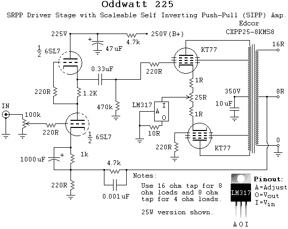Dit is trouwens hoe de regelaar defekt kan gaan: op het rooster staat een wisselspanning van 25Vrms bij maximale uitsturing. Als we dit optellen bij de roosterpolarisatiespanning (bijvoorbeeld -20V), dan bekomt men op de cathode en spanning dir gaat van -15V tot +55V. En het is juist deze hoge waarde die ervoor zorgt dat de spanningsregelaar defekt gaat (maximum 35V, ongeacht de stroom). Er bestaat ook een LM317-HV, maar de maximale spanning bedraagt 57V: de marge is dus zeer beperkt. Daarom dat je de elko ook best overbrugt met een 1µF polypropyleen condensator: als de elko uitdroogt (of zo maar defekt gaat) dan kunnen er spanningen ontstaan die de regelaar stuk trekken. En een defekte regelaar gaat meestal in kortsluiting, dus geen roostervoorspanning meer en roodgloeiende anodes!