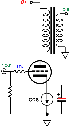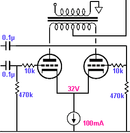 | Voor de polarisatie van de eindtrappen gebruikt men vaak een ontkoppelde cathodeweerstand (de andere methode is een negatieve roosterspanning). Maar in plaats van een cathodeweerstand kan men ook een constante stroombron gebruiken. |
