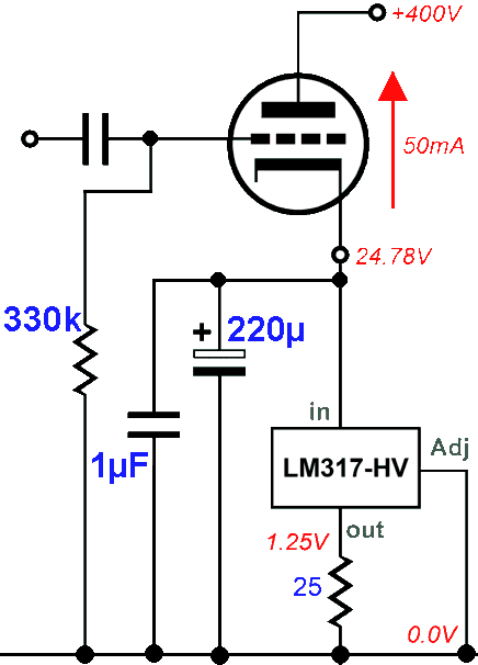 De LM317 (-HV) die als stabilisator gebruikt wordt is een perfecte stroombron, dus met een dynamische impedantie die oneindig is. In dit voorbeeld zal de regelaar de stroom stabiliseren op 50mA, dat de cathodespanning 5V of 35V bedraagt.