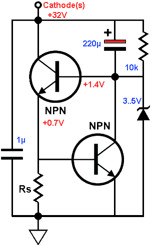 De onderste transistor kan bijvoorbeeld een BC148C zijn (hoe hoger de stroomversterking van de transistor, hoe beter). De spanning over de transistor is maximaal enkele volts (de zener van 3 à 5V beschermt de transistor). De bovenste transistor bepaalt de maximale spanning, je kan hier bijvoorbeeld een BUX87 gebruiken, dit is een transistor die tot 450V kan werken (wat dit parameter betreft zit je zeker safe). De maximale stroom bedraagt 500mA en dat zal wel voldoende zijn voor de meeste eindtrappen. De transistor bevestig je op de metalen frame om voldoende koeling te hebben, gebruik hiervoor isolatiemateriaal anders leg je de cathode(s) van de eindtrappen aan massa. De werking is eenvoudig: er begint een stroom te lopen door de weerstand van 10kΩ waardoor de bovenste transistor in geleiding komt. Dezelfde stroom loopt door de meetweerstand Rs. Van zodra de spanning over de weerstand hoger wordt dan 0.65V (hangt af van de gebruikte transistor), dan gaat de onderste transistor de basisstroom van de bovenste transistor beperken. Rs moet je kiezen zodat Rs = 0.65 / I. De regeling is niet zo nauwkeurig als die van een LM317. De condensator van 1µF vangt hier ook de transients op en de condensator van 220µF verlaagt de dynamische weerstand van de stroomstabilisator. De CCS kan je dus niet gebruiken in een long tail fasedraaier of een self inverting push pull.