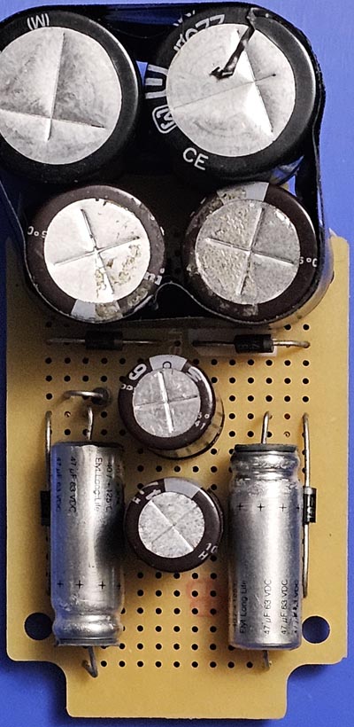 Hoogspanning met een midirack transfoHeb je geen geschikte hoogspanningstransfo, dan kan je ook een transformator uit een minirack of uit de versterker van een hifi keten gebruiken. Deze transformatoren leveren verschillende spanningen, die je bijvoorbeeld voor de negatieve roosterspanning kan gebruiken, enz.De transfo in ons voorbeeld levert tweemaal 36V 1.5A (spanning voor de eindtrappen). Met de schakeling rechts worden alle noodzakelijke hoogspanningen opgewekt. De spanning van 72V geeft ons 100V gelijkgericht en gebruiken we een spanningsverdubbelaar dan hebben we 200V. De manier van aansluiten zorgt ervoor dat we alle nodige spanningen hebben. We zetten het meest negatieve punt van de spanningsverdubbelaar aan massa. We hebben dus een spanning van 200V aan de andere kant van de spanningsverdubbelaar (dit is eigenlijk de massa van de transfo). De 200V gebruiken we voor de schermroosters. Met de normaal gelijkgerichte spanning hebben we 100V erbij, dus 300V voor de anodes van de eindtrappen. Een transformator van 75VA zoals gebruikt in een kleine hifi keten geeft een voldoende vermogen voor een versterker van tweemaal 20W (push pull in classe AB). De waarde van de elko's is berekend voor een stereo push pull versterker, maar je kan natuurlijk hogere condensatorwaarden gebruiken. De eerste schakeling is getekend voor een versterker met PL508, de tweede schakeling voor een versterker met PL504 die beter werkt met een lagere schermroosterspanning. Men denkt vaak dat een spanningsverdubbelaar nauwelijks stroom kan leveren, maar dit is niet waar. Een elko van 330µF heeft bijvoorbeeld een impedantie van 10Ω bij 50Hz, dat is veel minder dan de weerstand van de hoogspanningswikkeling van een normale transfo voor buizenversterkers. Men moet er enkel rekening houden met het feit dat de stroom door de condensator het dubbele is dan de stroom door de buizen. Dit vormt geen probleem als men kwaliteitselko's gebruikt. Bij één van mijn laatste versterkers voor een vermogen van tweemaal 20W (4 EL508) gebruik ik een scheidingstransfo van 230V - 230V 60VA. Op vol vermogen zakte de spanning van 330V naar 280V, waardoor ik verplicht was een corrigerende voeding voor de schermroosters te gebruiken (dit is nu de versterker die de beste geluidskwaliteit levert). Bij een andere versterker met hetzelfde vermogen maar een midirack transfo QQT-0323-002 en spanningsverdubbelaars zakte de spanning van 305V naar 295V (onbelast naar vol vermogen). Een andere stereo versterker voor 2 X 18W met een 65VA transformator (enkel gebruikt voor de hoogspanning) had zijn anodespanning die van 318V (in rust) naar 262V zakte op vol vermogen (schermroosterspanning van 159 naar 130V). Dit is duidelijk teveel. Als de versterker gevoed werd met een transfo uit een afgedankte hifi versterker zakte de spanning van 291 naar 282V, wat een heel goede waarde is. De weerstand van de secundaire wikkeling voor hoogspanning bedraagt ongeveer 100Ω (wikkeling voor 30VA). Bij een totale anodestroom van 100mA (audiovermogen ongeveer 10W) hebben we een theoretische spanningsval van 10V, een aanvaardbare waarde. Maar door de werking van de diode en de filterelko is de diode slechts 20% van de totale tijd in geleiding, de stroom bedraagt dan 500mA, met een spanningsval van 50V, en dat is wel een te hoge waarde. De weerstand van een transfo voor midirack bedraagt ongeveer 5Ω. Zelfs als we een hogere stroom voorzien van 400mA (dubbele spanningsvermenigvuldiger) zitten we aan een spanningsval van 2V. Maal 4 en we zitten nog niet aan 10V. Een transformator van een bepaald vermogen (bijvoorbeeld 100VA) met een uitgang van tweemaal 40V en spanningsverdubbelaars geeft een spanning die meer stabiel is dan een transformator die de juiste spanning geeft aan een bruggelijkrichter. Ik heb testen uitgevoerd met verschillende transfo's Een constante hoogspanning is belangrijk om een hoog vermogen te halen zonder verplaatsing van het werkpunt. Met een pentode (die zich gedraagt als een stroombron) hebben we bij een daling van de voedingsspanning van 10% een vermindering van het vermogen van 10%. Maar een beam tetrode (EL504, EL508, EL509, KT77,...) wordt ook gestuurd door de schermroosterspanning. Een daling van de g2-spanning met 10% veroorzaakt een vermindering van het vermogen van 25%, vooral door de veranderde instelling. Indien de hoogspanning onvoldoende stabiel is (en dit geldt zowel voor de voedingen met normale hoogspanningstransfo's als de voedingen met spanningsverdubbelaars) kan men een kleine schakeling bijplaatsen die de spanning van de stuurroosters aanpast naargelang de hoogspanning, om zo een stabiele werking te bekomen, zelfs met veranderlijke voedingspanning. De schakeling is bijzonder eenvoudig. Rechts een klad van een voeding met spanningsverdubbelaars. Het lijkt ingewikkeld maar is dat niet. De schakeling levert alle nodige spanningen.
