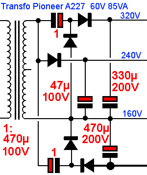 - De 240V is de spanning voor de voorversterker (ik gebruik een getransistoriseerde voorversterker en fase omkeertrap). De stroon bedraagt constant 5mA.