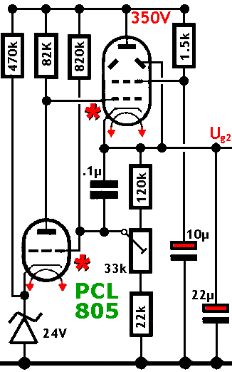 Bij een buizenversterker moet er feitelijk maar één spanning gestabiliseerd worden, en dat is de schermroosterspanning van de eindtrappen, zeker als men het maximaal vermogen uit de buis wilt halen.