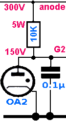 Laatste afbeelding rechts: Bij kleine eindtrappen met bijvoorbeeld een paar EL508 volstaat vaak een spanningstabilisatie met een stabilisatorbuis zoals de OA2. Deze buis werkt zoals een zenerdiode. Je kan eventueel in de plaats van de OA2 een silicium zenerdiode van 150V 5W gebruiken, maar dan mis je de gloed van een ontladingslamp. Als een silicium zenerdiode begint licht af te geven, dan was er iets mis met je schakeling. Deze stabilisatie kan je toepassen als de hoogspanning niet al te constant is en varieert naargelang de belasting. Dit gebeurt vaker als je een hoogspanningstransfo gebruikt die een beetje nipt is, maar zelfs een transfo met een voldoende vermogen kan een spanningsverandering van 10% hebben tussen nullast en vollast. Je moet een condensator gebruiken op de uitgang van de stabilisatorbuis, want die buizen produceren een sterke ruis. De waarde is verplicht 0.1µF: een te lage waarde onderdrukt de ruis onvoldoende en met een hogere waarde kan de spanning gaan oscilleren. De waarde van de weerstand pas je aan aan de hoogspanning: de buis kan een maximale stroom van 30mA verdragen en de stabilisatie is enkel gegarandeerd als de stroom minstens 5mA bedraagt. Eén stabilisatorbuis is voldoende voor 4 EL508 tetrodes als de stroom door de weerstand tussen 25 en 30mA ligt. Een versterker met een hoger vermogen en EL504 eindtrappen heeft één stabilisator nodig per kanaal. |